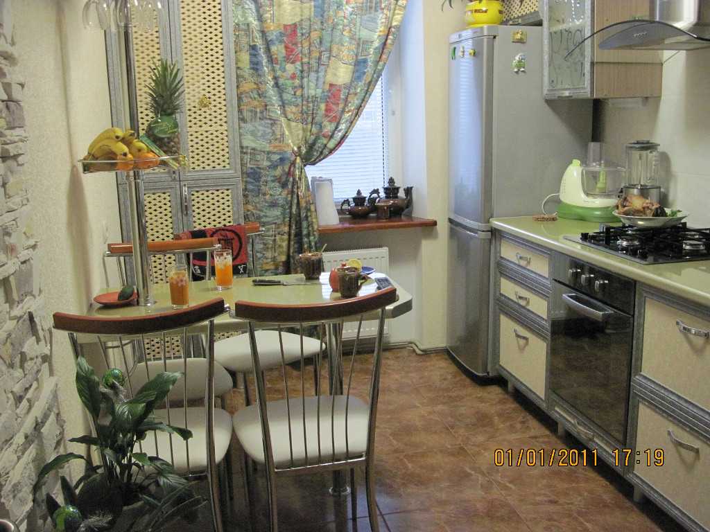 Обеденный гарнитур, без которого на кухне не обойтись, должен иметь компактные размеры. Лучше всего выбирать стулья, которые можно легко задвинуть под стол. Заменить обычный обеденный стол также можно откидной столешницей, прикрепленной к подоконнику, либо к стене кухни.