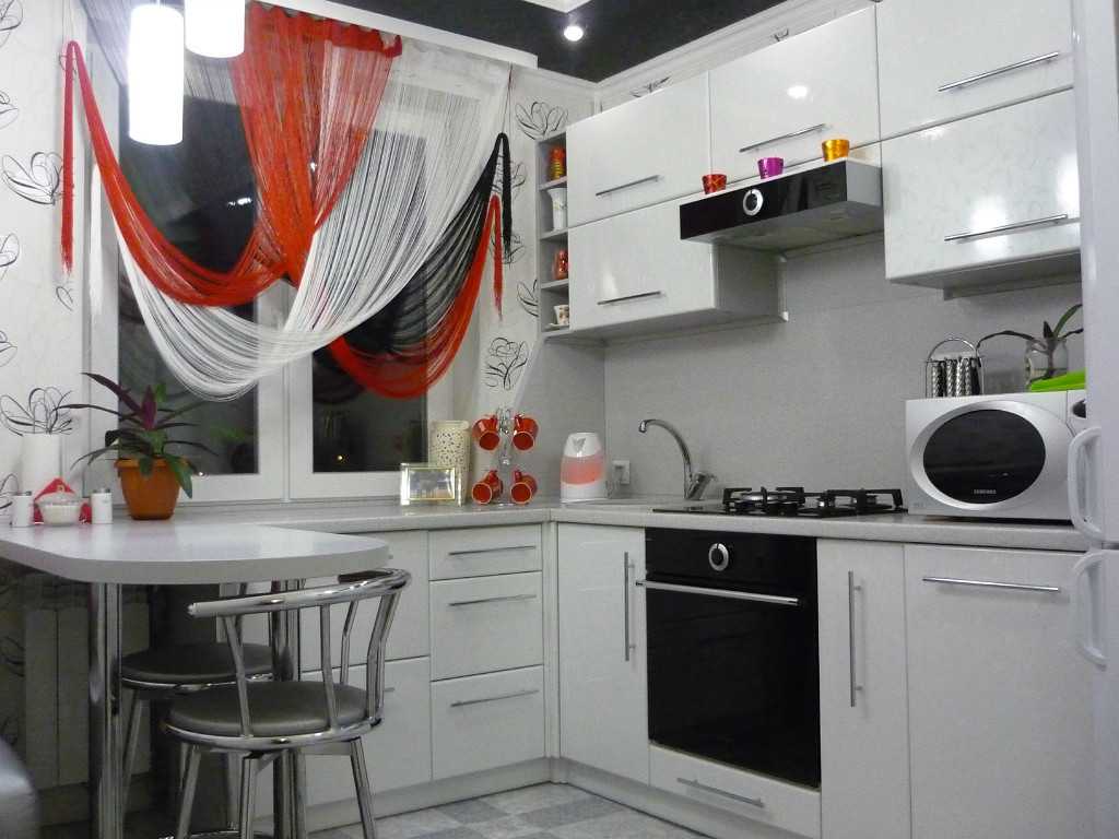 Шторы должны быть из легкого материала и с мелким рисунком. Идеальным решением для маленькой кухни будет белый текстиль.
