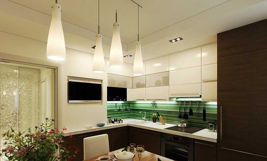 Поработайте с освещением. Не обязательно вешать громоздкую люстру. Она только испортит интерьер. Замените ее красивыми и современными светильниками, которые будут располагаться по всей кухне.