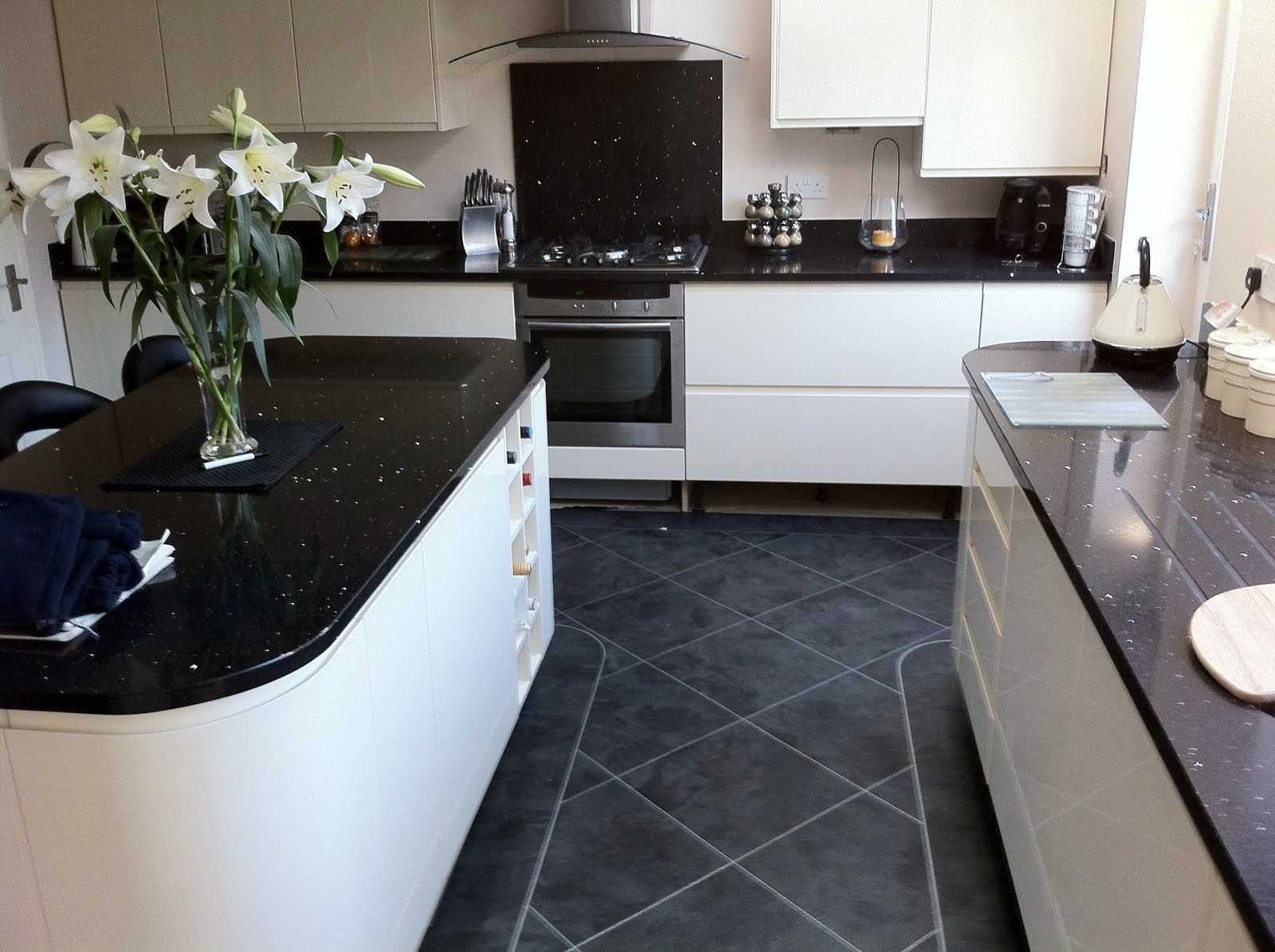 Если на вашей кухни черный потолок, то пол обязательно нужно сделать на контрасте. Это не будет зрительно давить и уменьшать высоту помещения.