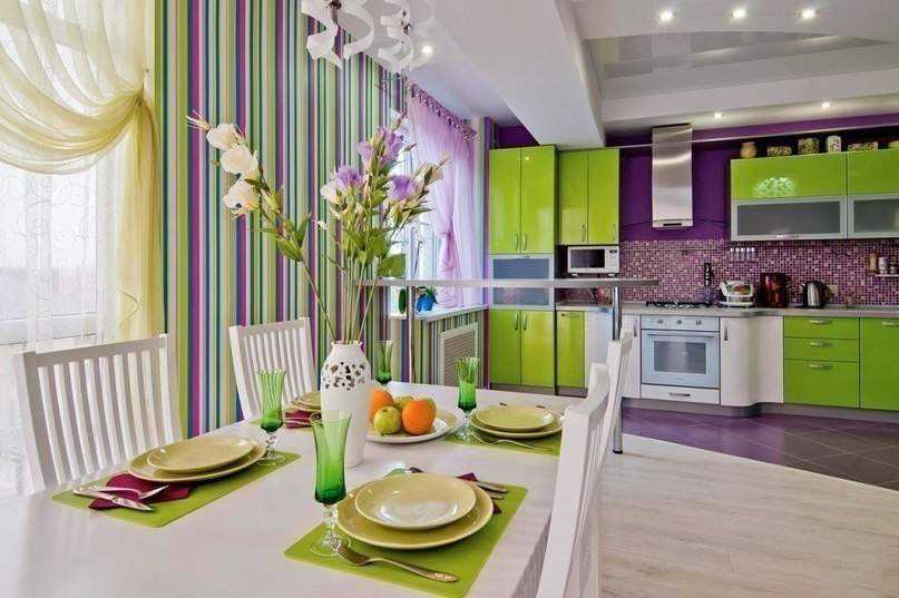 Особое место в оформлении интерьера занимает фиолетовый и все его оттенки, которые создают удачные комбинации только между собой, с белым, голубым и некоторыми тонами зеленого и коричневого. Составляя композицию для сиреневой кухни, необходимо помнить, что при неудачном подборе мебели, облицовки мойки и фартука, осветительных приборов может получиться раздражающая гамма, что плохо отразится на качестве еды и самочувствии.