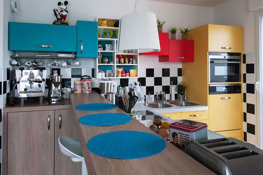 Кухня небольших размеров тоже может быть достаточно яркой. Используемые яркие оттенки не должны быть слишком темными, следует отдавать предпочтение зеленому, оранжевому, красному, желтому, голубому.