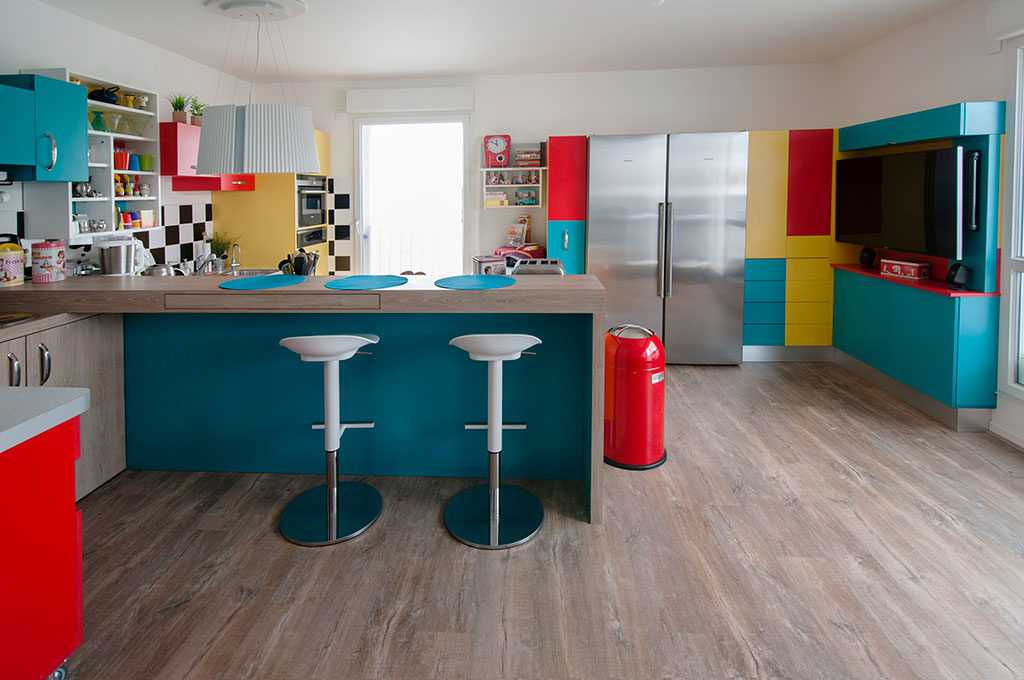 Если вы хотите сделать кухню в стиле постмодернизма, можно за основу взять яркие тёплые цвета с добавлением контрастов. Контрасты на кухне не будут «мозолить» глаза. Тёмные цвета редко используются, но это не значит, что их не стоит применять.