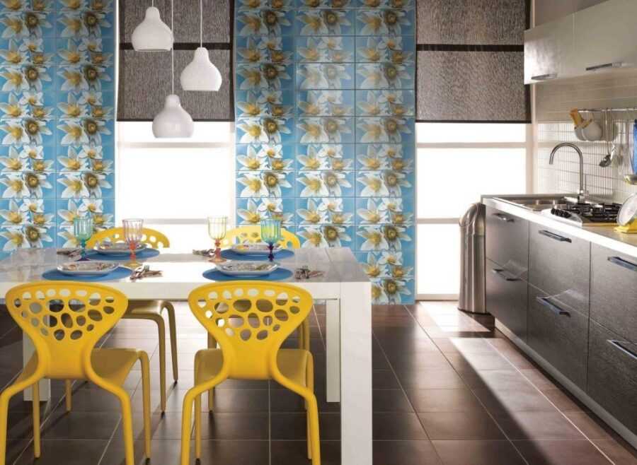 В качестве основного фона рекомендуется выбирать бежевый, белый, светло-серый, светло-голубой или светло-желтый цвет. Достаточно светлыми должны быть стены, потолок, гарнитур. В ярких тонах будут отлично смотреться кухонный фартук, нижние фасады, стол и стулья, аксессуары и декоративная посуда. Неплохое решение для отделки пола в такой кухне — черно-белая плитка в виде шахматной доски.