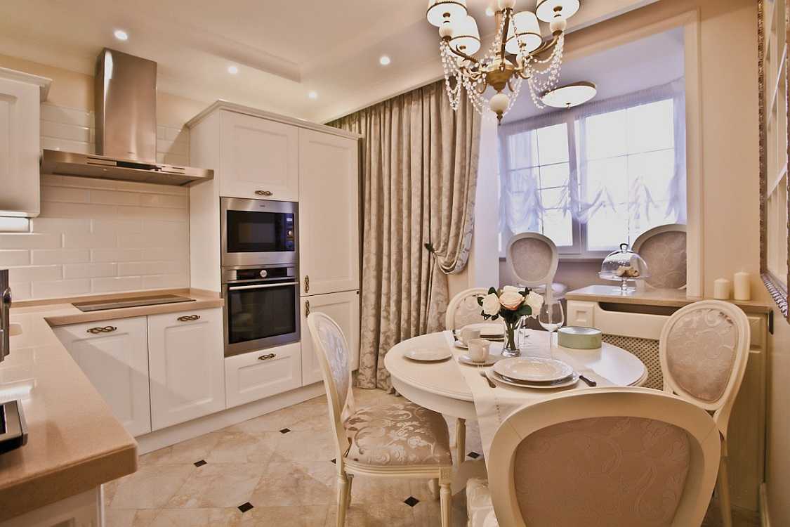Хотите применить классику в типовой кухне хрущевки? Тут от крупногабаритной мебели придется отказаться. Впрочем, кто сказал, что бежевый угловой гарнитур выглядит плохо? Выбирайте модели с золотистой патиной на фасадах — они выглядят дорого и изысканно.