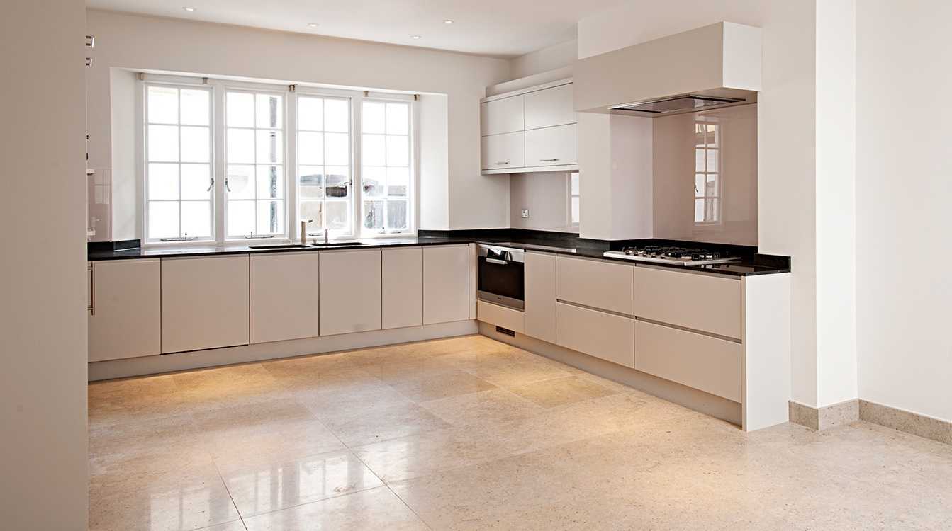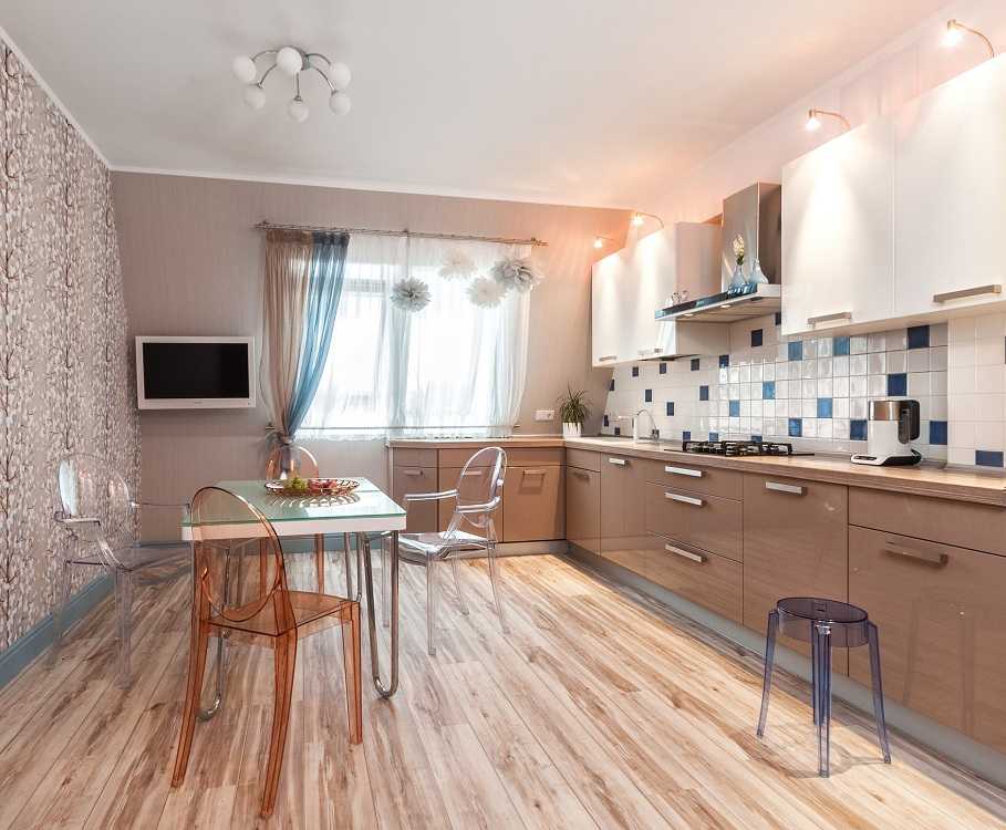 К кухне в бежевых тонах подходят все виды напольного покрытия в рамках этой гаммы. Так, допустимо использовать:
