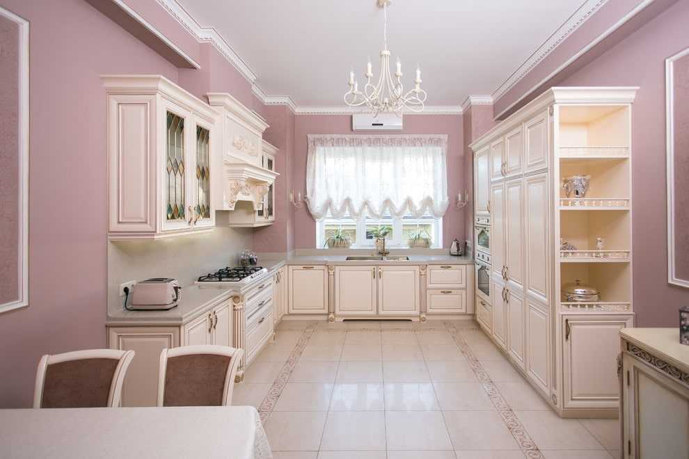 Просторная кухня цвета топленого молока смотрится очень изящно даже без дополнительных украшений. Все, что вам потребуется — подобрать стильный гарнитур и броскую эффектную люстру. Этот интерьер самодостаточен сам по себе, так зачем изобретать велосипед?