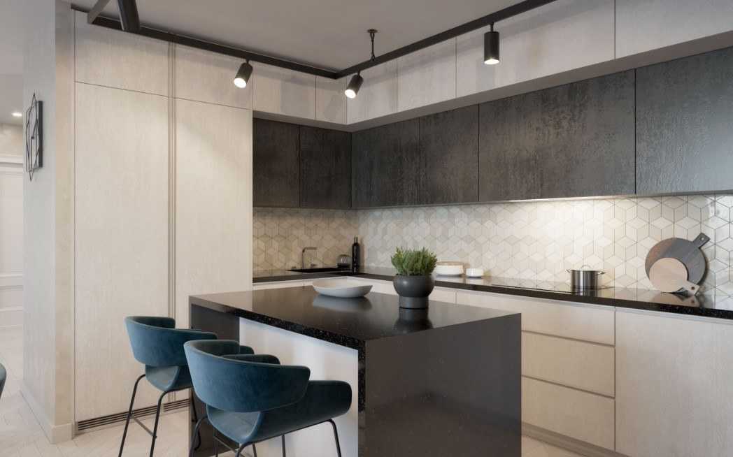 Обычно такую контрастную цветовую гамму применяют для придания интерьеру четкости и строгости или роскоши и элегантности. Это сочетание также подходит для визуального отдаления предметов друг от друга, что при наличии маленькой комнаты может придать ей высоту и зрительно расширить. Черным делают столешницу, которая расположена в рабочей зоне, или мебель, например, стулья или стол.