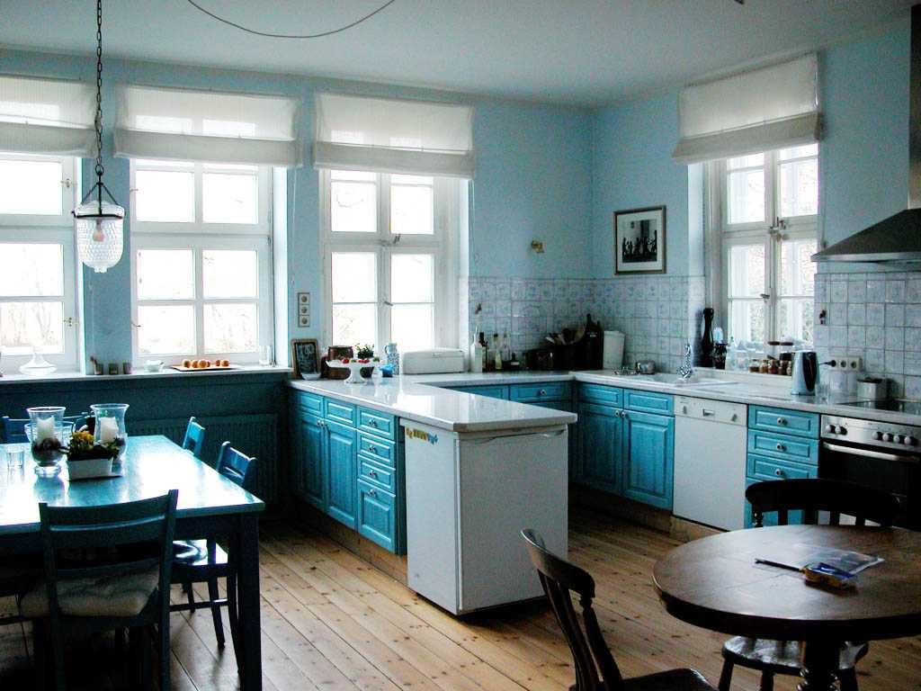 Лёгкий, небесно-голубой оттенок великолепно смотрится в качестве основного цвета на стенах кухни