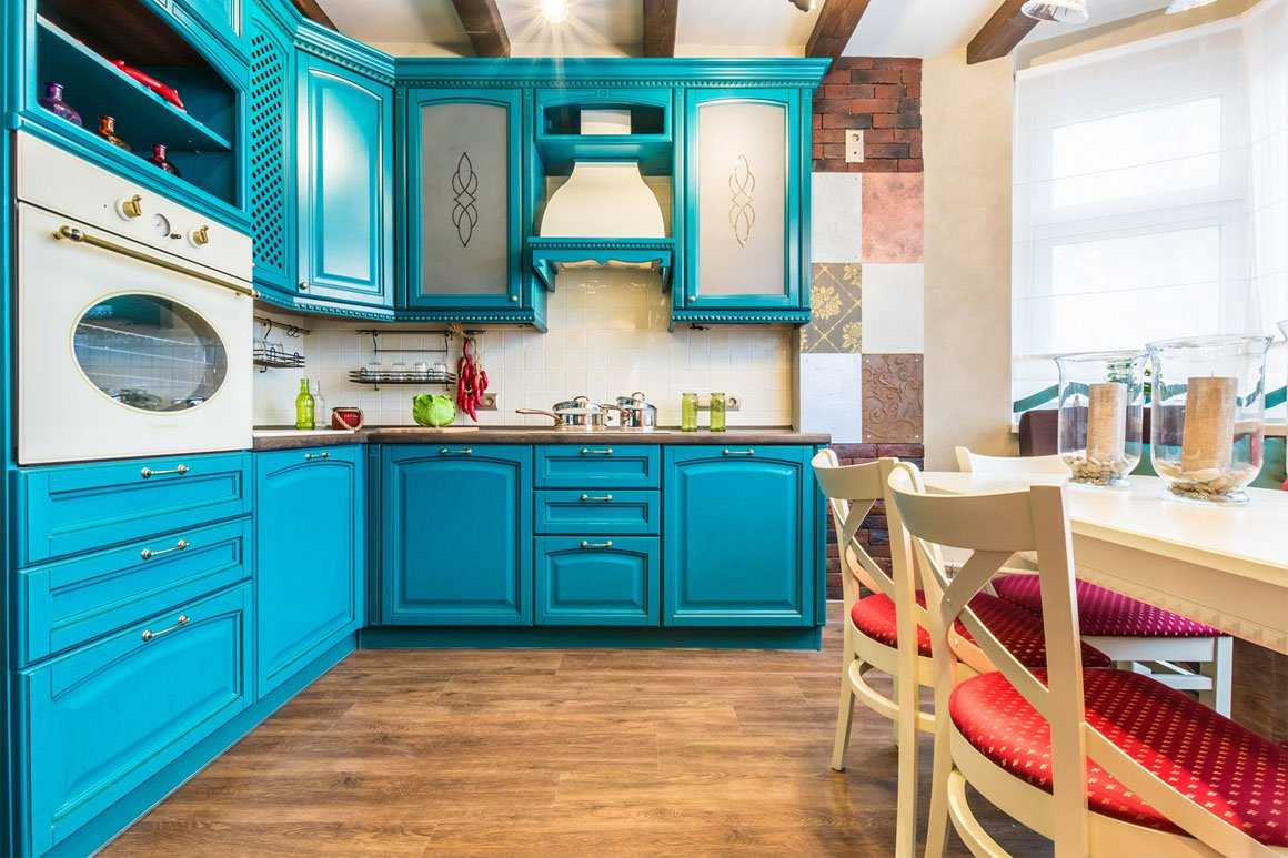 Бирюзовый цвет будет гармоничным решением для вашей кухни, если грамотно подобрать цвета-компаньоны.