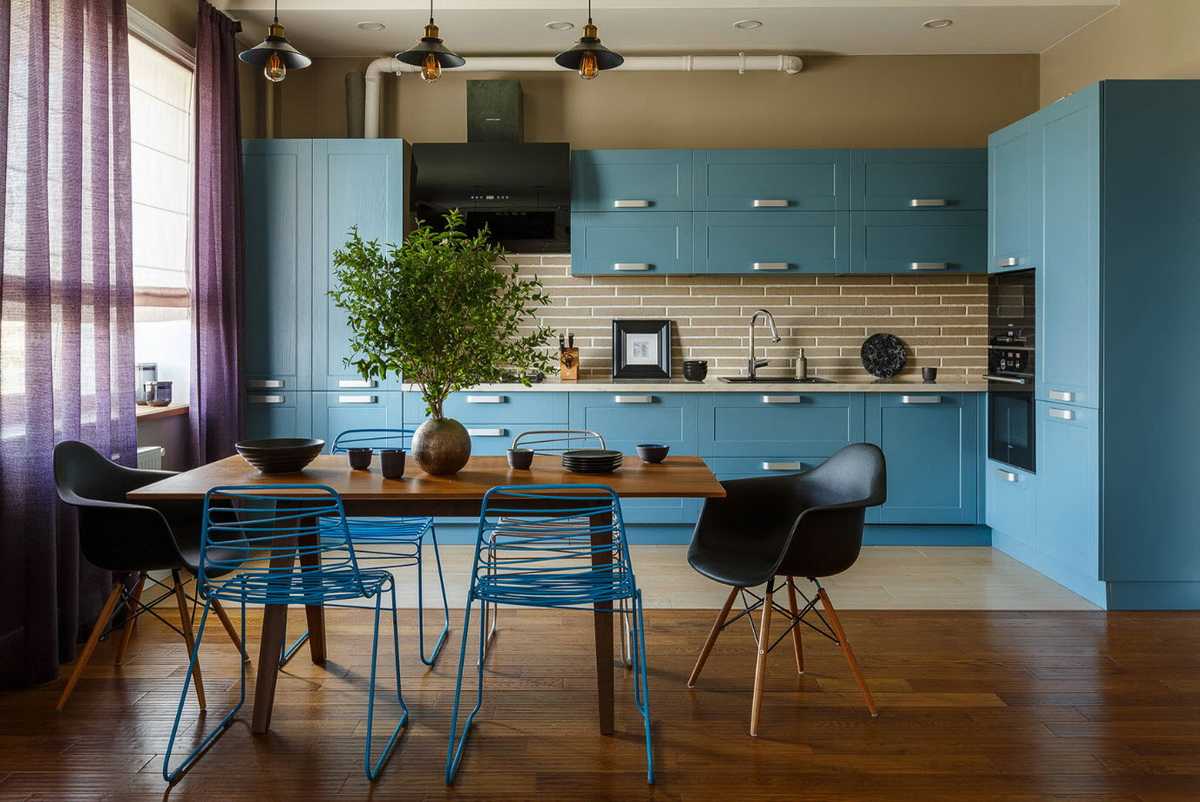 - Голубовато-синий – им оформляют большие участки кухонного пространства;