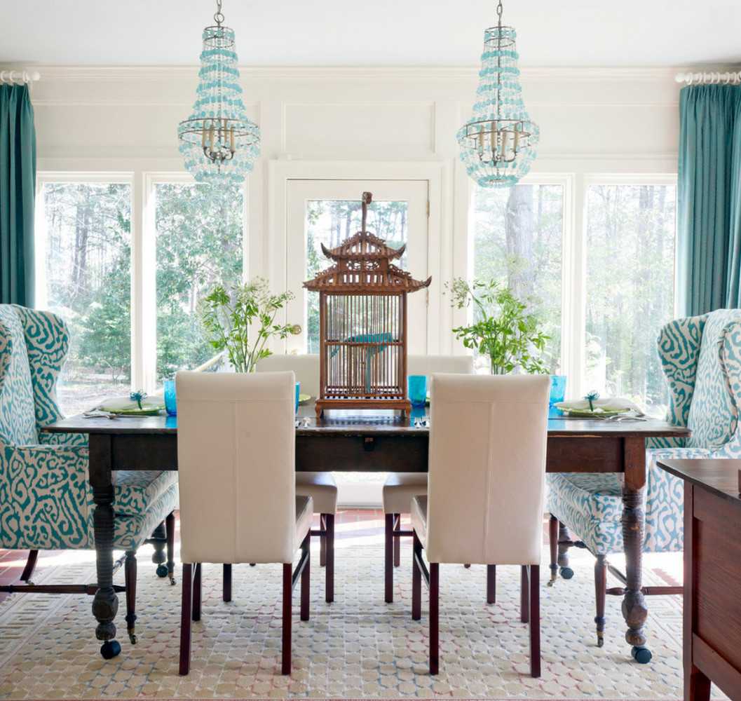 Чтобы сконцентрировать внимание на обеденном столе, гарнитур лучше выбрать светлым однотонным. Если фасады гарнитура изобилуют бирюзовым декором, обеденную зону можно оформить в белом цвете, а основной акцент сделать на кресельной обивке
