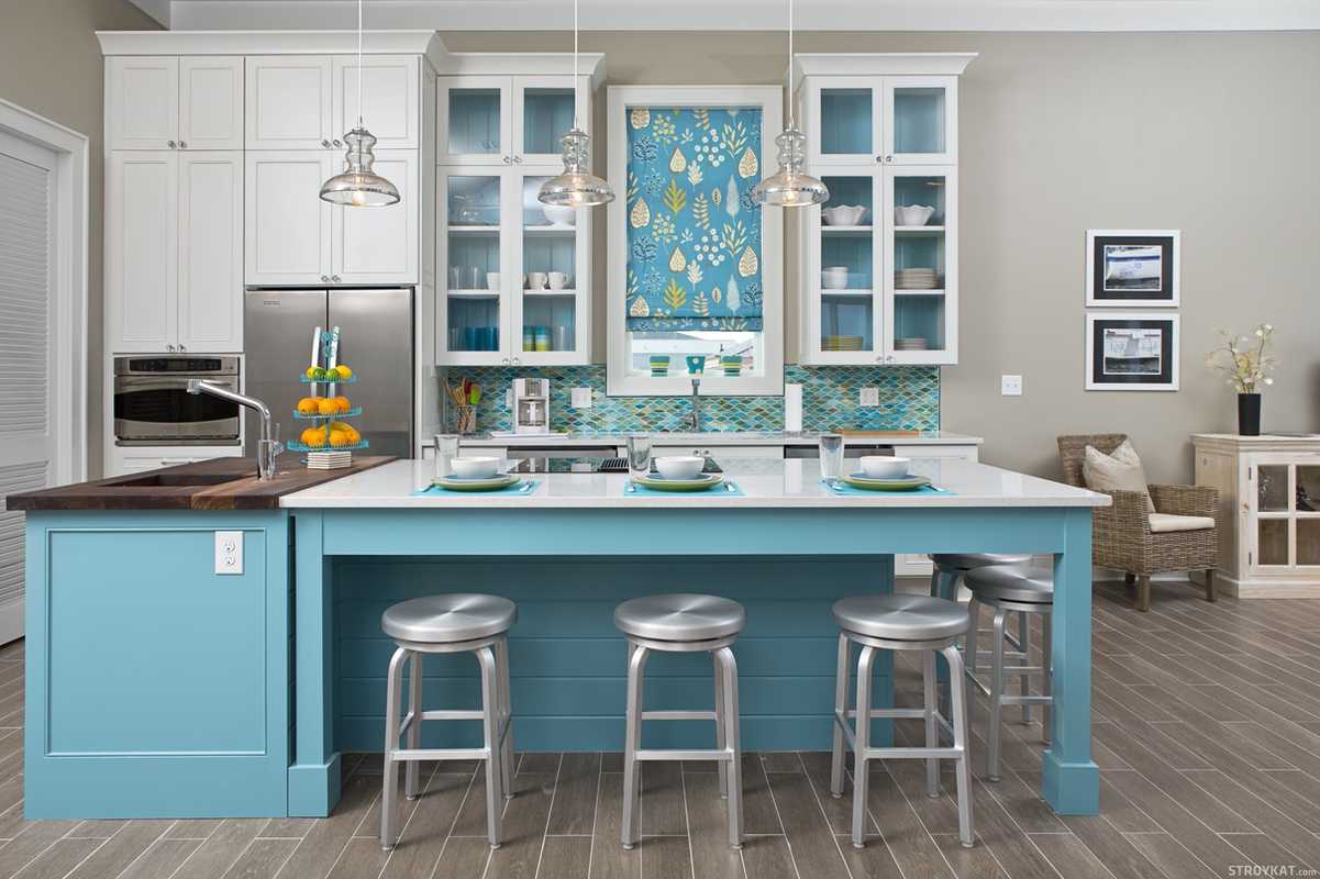 Кухня бирюзового цвета с островом и яркими акцентамиИсточник robdom.ru