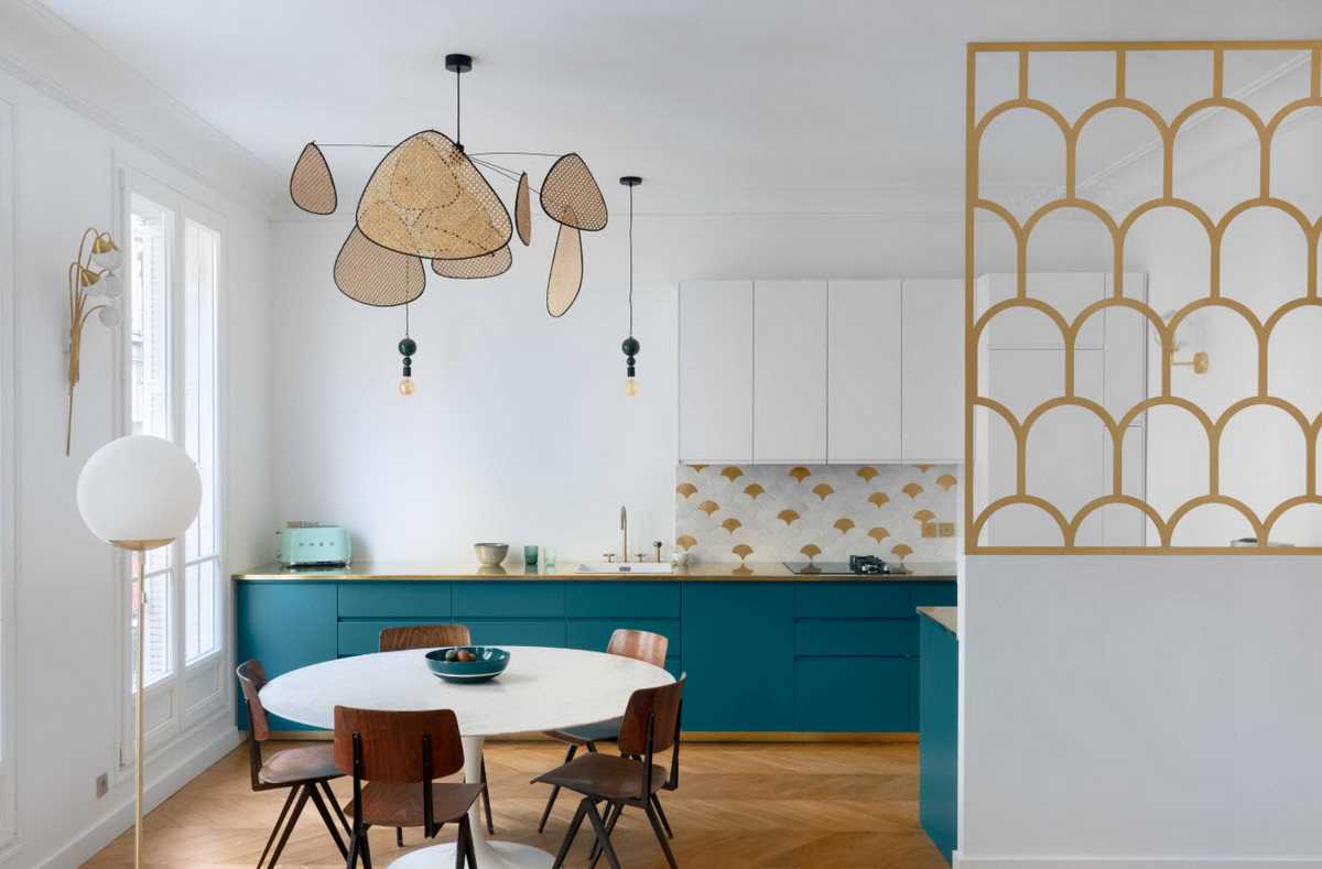Кухня бирюзового цвета может быть дополнена золотым декором. Такая комбинация цветов позволяет создать роскошный дизайн в стиле современная классика.