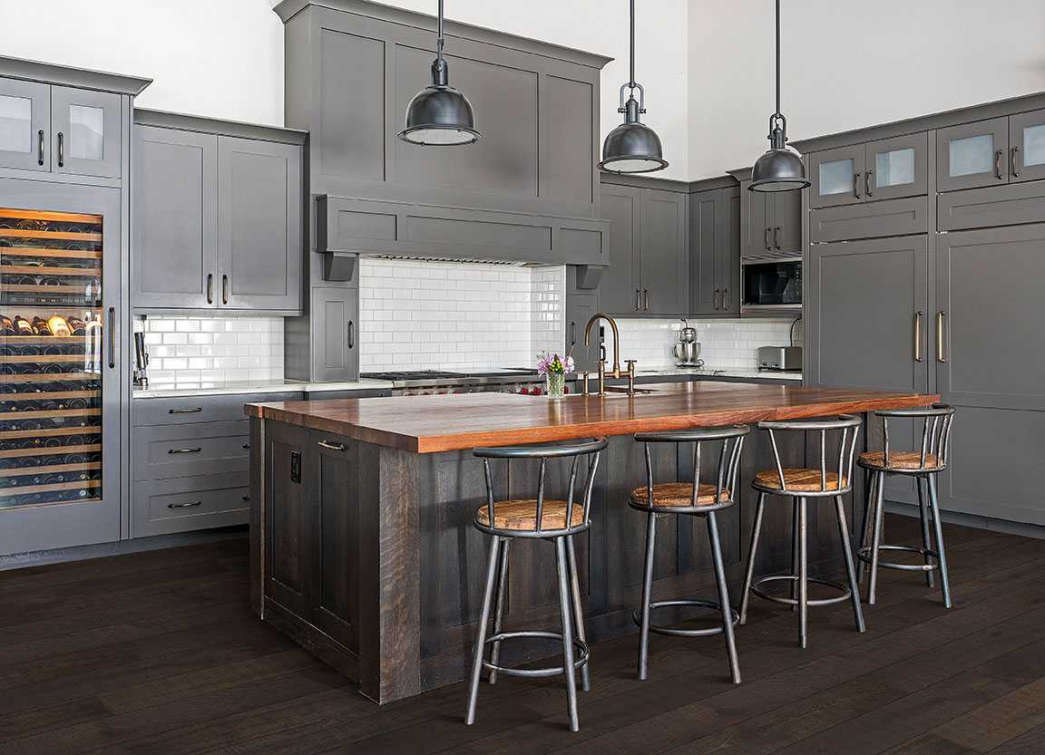 Деревянная столешница придаст серой кухне эффектный вид, но может доставить вам некоторые проблемы. Пропитка не обеспечит полной стойкости к появлению пятен, поэтому пролитый цветной напиток необходимо немедленно стереть. Деревянная столешница также не устойчива к высоким температурам, поэтому на нее не поставишь горячую кастрюлю, что возможно с гранитной столешницей.