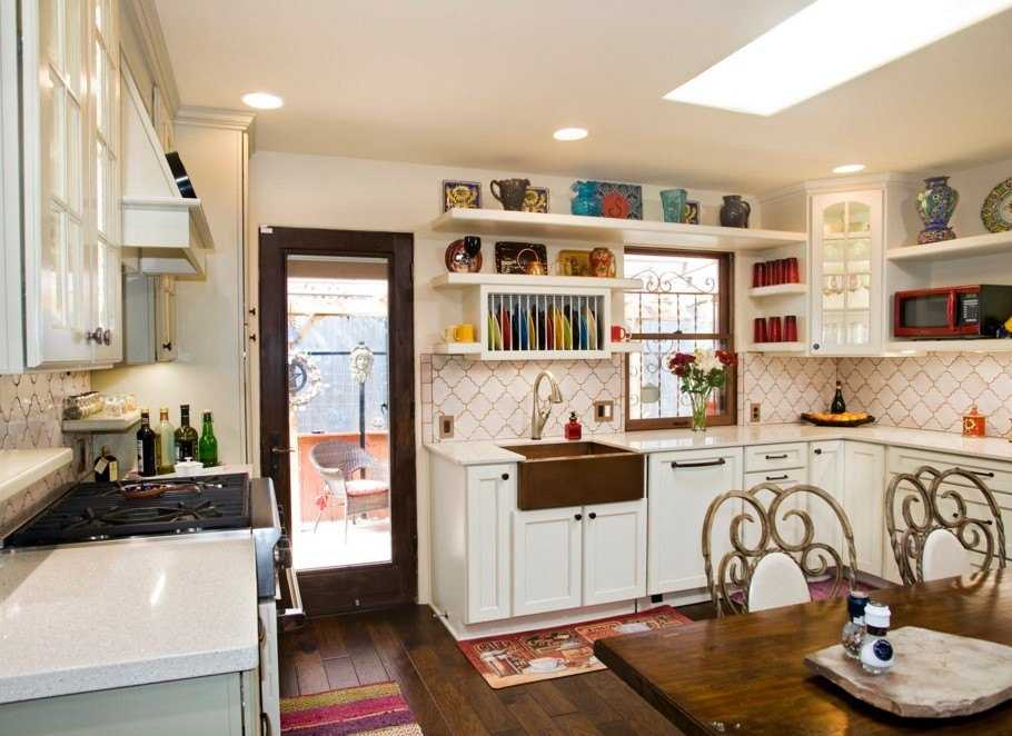 Чтобы кухня выглядела более просторной, белый цвет должен на ней доминировать. В белом оттенке следует оформить стены, подобрать такого же цвета кухонный гарнитур, даже пол может быть уложен из керамической плитки белого, бежевого либо другого очень светлого цвета.