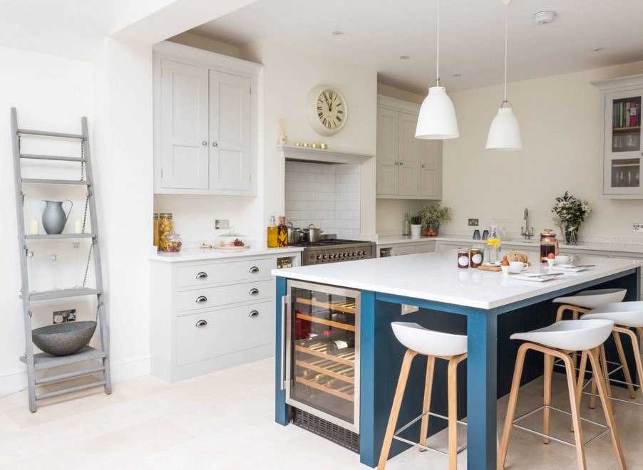 Чтобы помещение не напоминало стерильную операционную или лабораторию, к нему необходимо добавить несколько ярких цветовых оттенков. Например, украсить окна голубыми занавесками, обустроить фартук в голубых тонах, установить голубые стулья и обеденный стол.