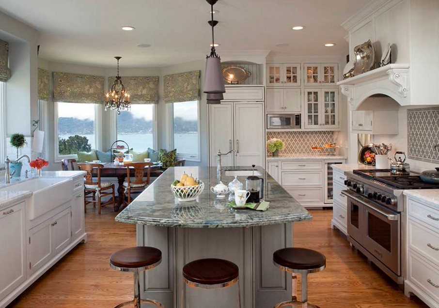 Очень часто используется натуральная древесина, в том числе и цвета беленый дуб. И хотя такие расцветки не очень хороши на кухне, потому что требуют постоянного ухода и контроля чистоты, смотрятся они просто великолепно. Но не стоит скидывать со счетов и обычные белые кухни, украшенные сталью или красивыми ручками для шкафчиков.