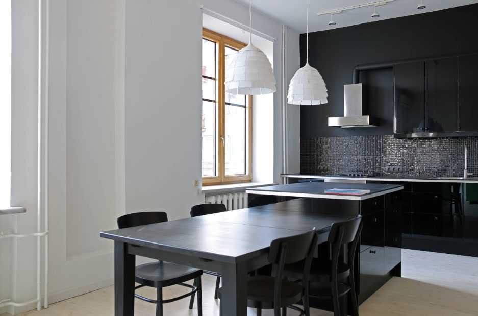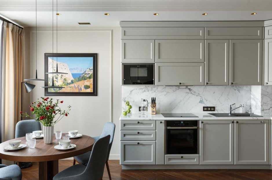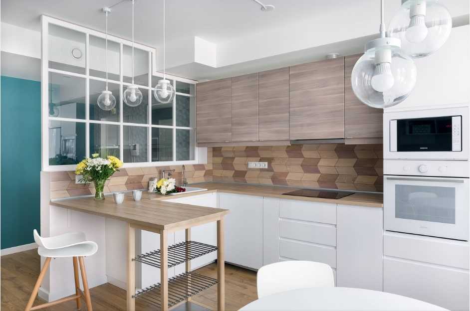 Свободная кухня в современном стиле предполагает наличие акцентов из дерева, камня или их имитации на фоне стен под покраску.