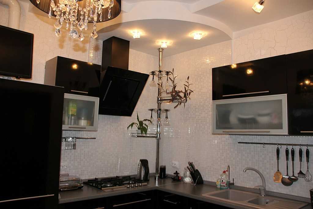 Освещение помогает сделать кухню визуально просторнее. Необходимо использовать подсветку в рабочей зоне, чтобы черная столешница не создавала темное пятно. Люстрой освещается обеденный стол. Если предусмотрена зона отдыха, устанавливают бра и торшеры.