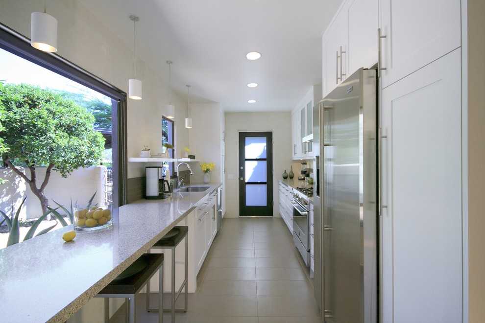 В современном строительстве часто кухне не придается должного значения. Это отражается на размере и форме помещения. Удлиненная комната, напоминающая вагончик, страдает от недостатка света и пространства. Выходом могут стать два окна на противоположных стенах и кухонная мебель, расположенная вдоль стен с окнами. В данном случае уместен дизайнерский ход по соединению рабочей поверхности с подоконником. Этим удастся сэкономить пространство помещения и не ограничивать в движениях того, кто будет пользоваться этой поверхностью.