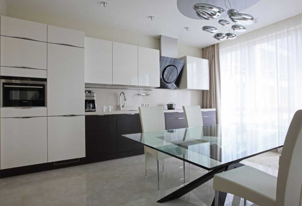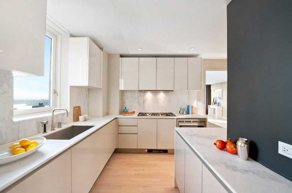 Просторным квадратным и прямоугольным помещениям без такой мебели не обойтись. Большая площадь позволяет укомплектовать гарнитур различными системами, при этом обеспечить удобное соседство с бытовыми приборами. Здесь главное соблюсти баланс: длина параллельных линий кухни должна составлять 1,5-2 м, а соединяющая их часть – до 2,5 м. От гарнитура, не вписывающегося в эти рамки, лучше отказаться в пользу других видов мебели. Удаленное расположение различных зон друг от друга напрямую влияет на удобство их эксплуатации.