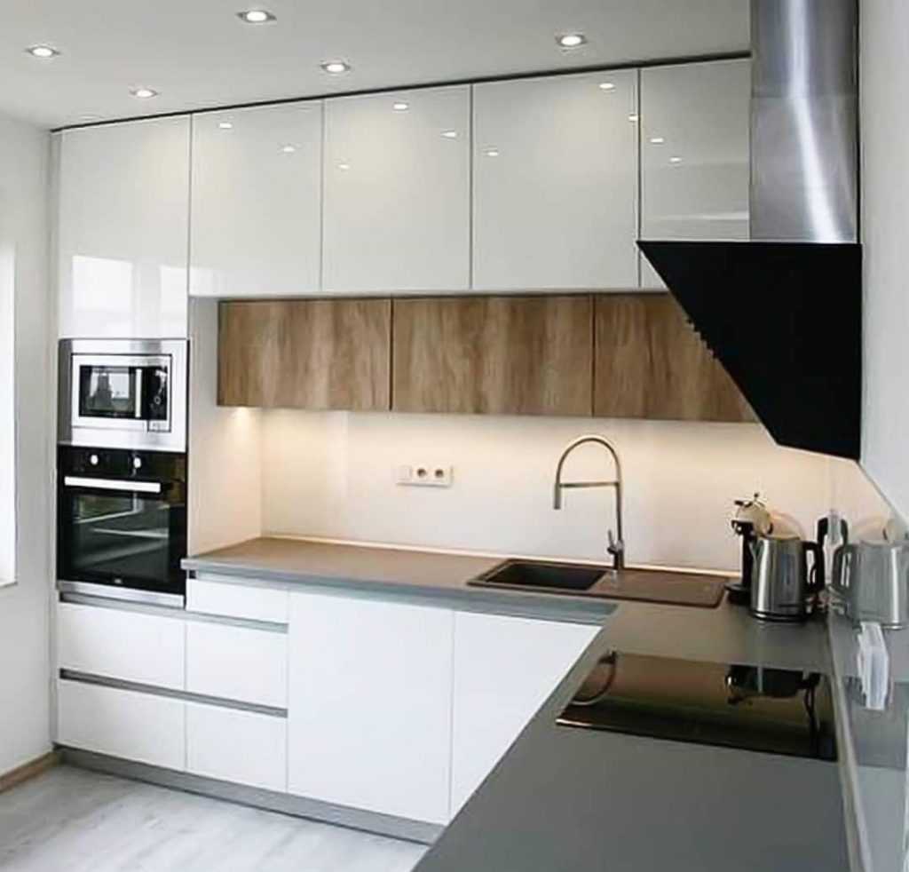 Классика жанра для квадратных кухонь. Рабочая зона состоит из функциональных отделов под хранение, мойку и готовку, для которых покупают модульный L-образный гарнитур. Чтобы по максимуму задействовать угловую зону, устанавливают многоуровневую выдвижную систему.