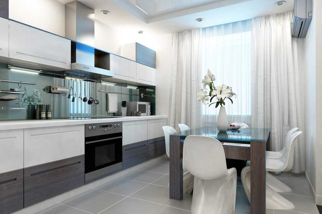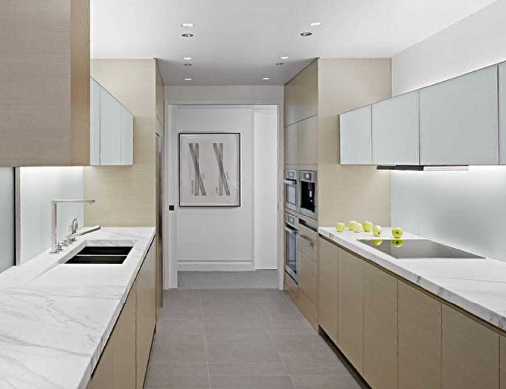 Двухрядный гарнитур подходит для вытянутых помещений. Такая планировка спасает положение, когда площадь кухни составляет больше 9 м2, а ширина – не менее 2,5 м. Между двумя рядами оставляют проход в 120 см, разгружают пространство системой Push to open, чтобы отказаться от ручек и открывать дверцы шкафчиков легким прикосновением руки. В вытянутых помещениях обеденная зона выражена не четко или отсутствует вовсе.