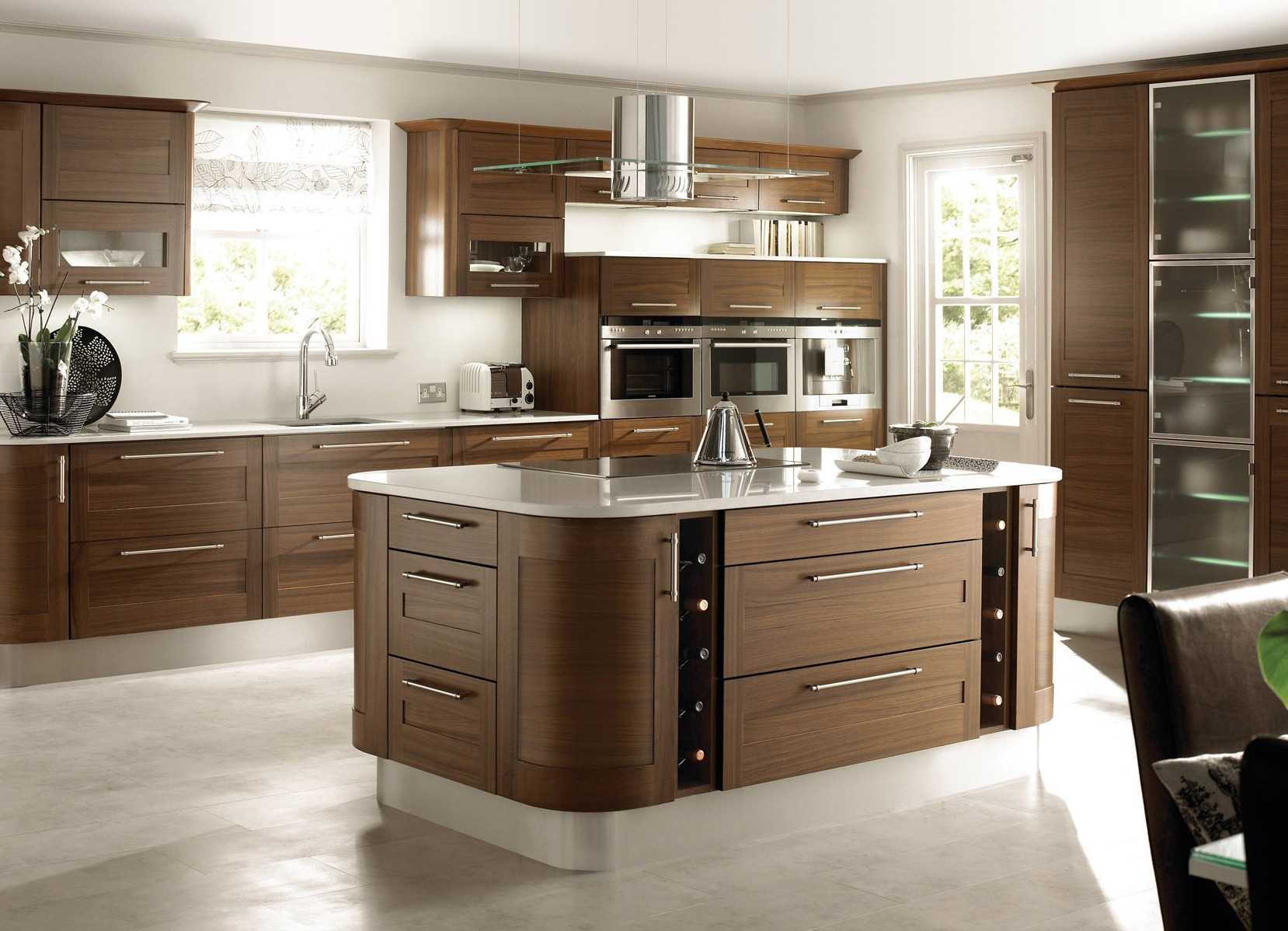 Мебель коричневого цвета может быть очень многогранна. Привычный нам вариант – классический солидный деревянный фасад всех оттенков шоколада. Однако современное производство кухонной мебели успешно имитирует пластиковую, мраморную и стеклянную фактуры, что позволяет отойти от привычного стиля кухни в бежево-коричневых тонах.