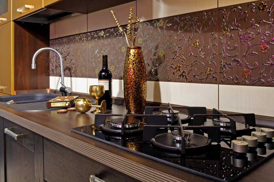Хороший пример — гарнитур шоколадного цвета на фоне таких же стен. Он выглядит благородно и элегантно, а светлая столешница подчеркивает насыщенность основного тона.