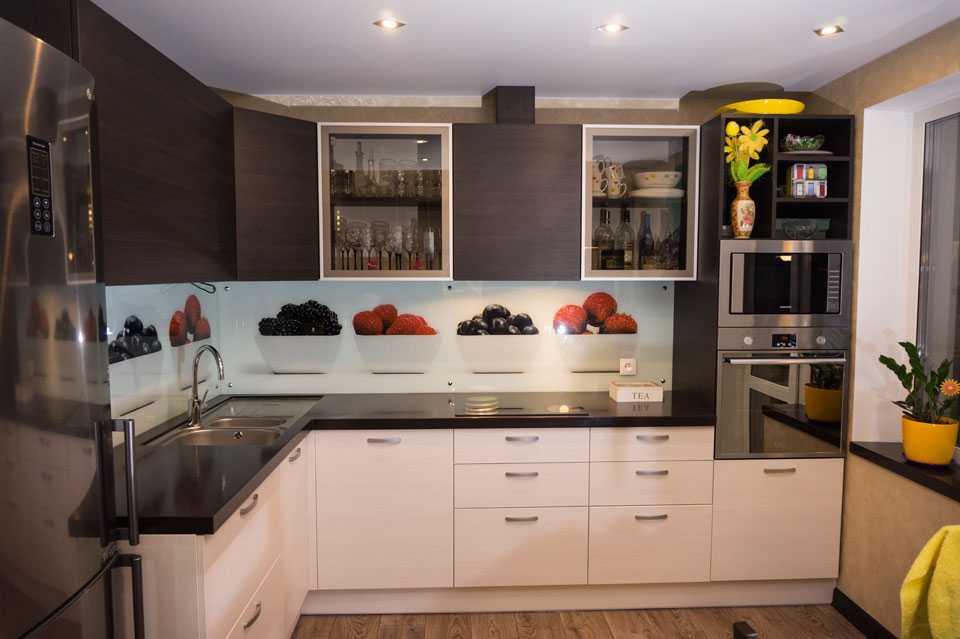 Коричневый цвет плохо сочетается с цветами белого и черного и спектра. Если стены все же оформлены белоснежным колером, то стоит подобрать черно-коричневый кухонный гарнитур и обставить его аксессуарами мягких оттенков (например, ягодных). Так кухня сможет стать более уютной, и не будет выглядеть официально. Дизайн кухни в коричневых тонах в современном стиле, разбавленный белыми элементами можно увидеть на фото, и оценить до того, как будет отделываться помещение.