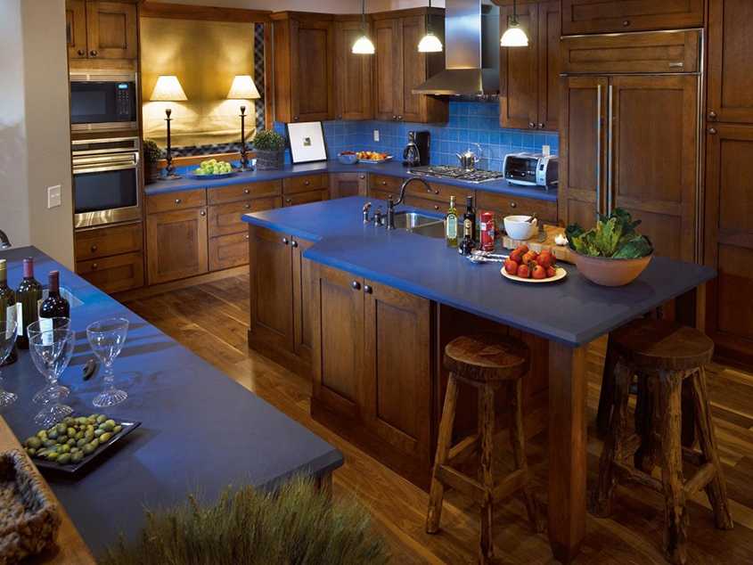 Являясь в какой-то мере оттенком коричневого, дерево является одним из лучших компаньонов синевы. Такое сочетание может использоваться в кухнях любого стиля и исполнения: дерево будет хорошо смотреться в качестве практически любой детали интерьера.