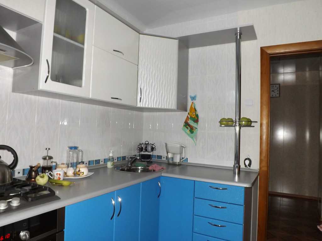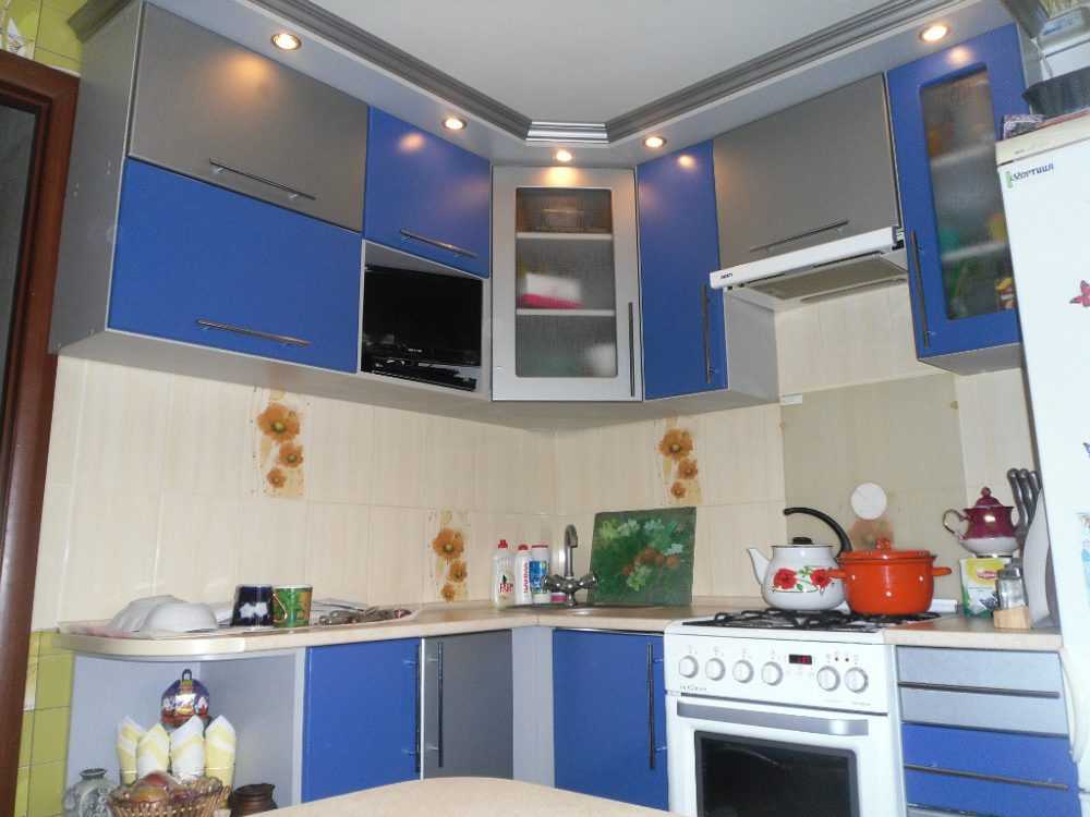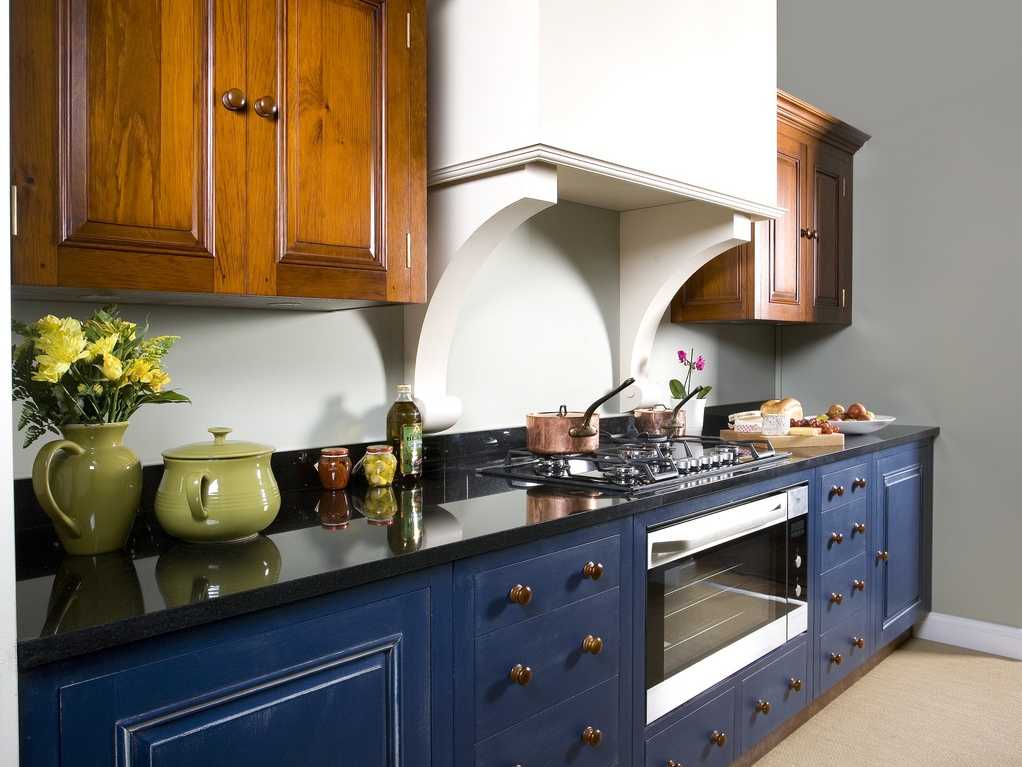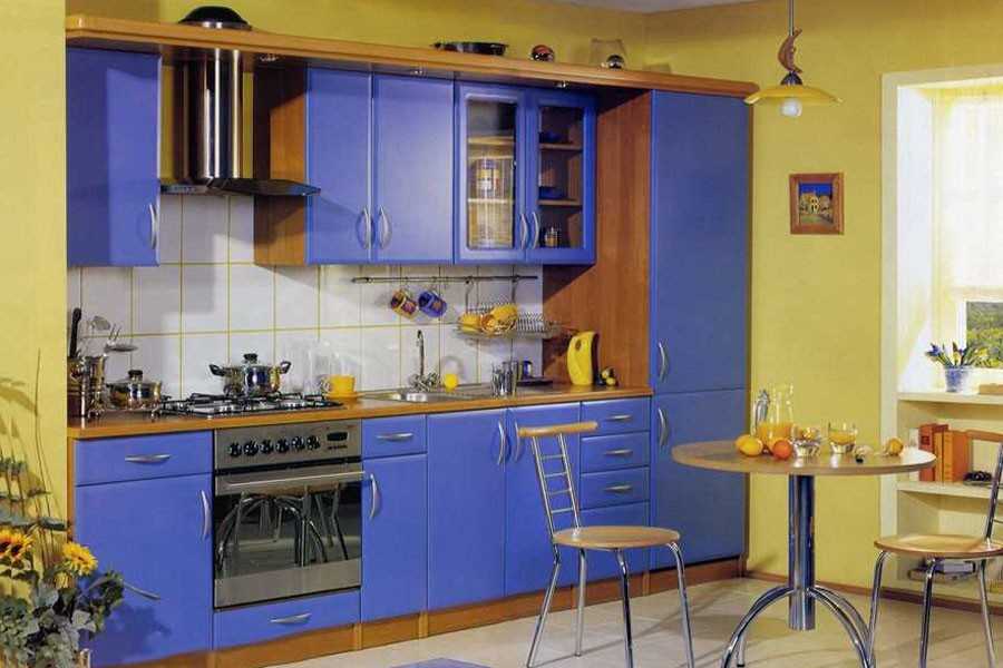Всю площадь кухни не стоит оформлять одним цветом. Необходимо добиться гармоничного сочетания оттенков и создать уютную атмосферу, в которой вам будет нравиться проводить время. К примеру, стены можете окрасить в насыщенный голубой тон, поскольку синий цвет отлично смотрится с деревянной мебелью в коричневых тонах. Наверняка красиво будет выглядеть и белая обстановка на фоне синих стен. Также можно совмещать противоположные цвета: синюю мебель на фоне стен, окрашенных в белый.