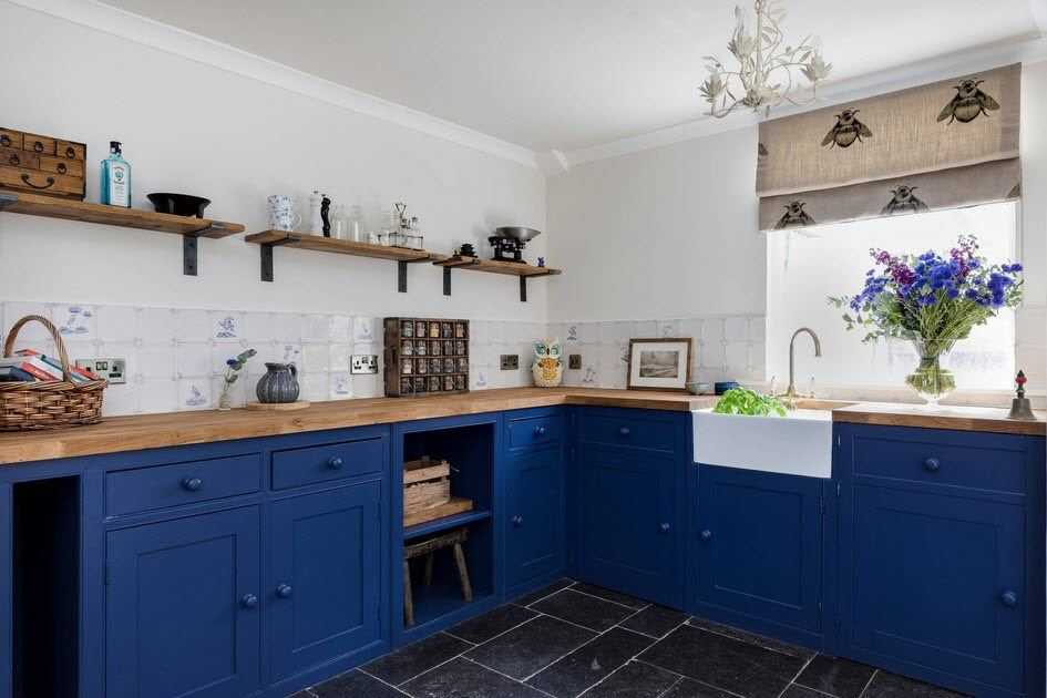 Другой возможный вариант дизайна помещения с синей мебелью – это выбор плитки для фартука того же оттенка, что и шкафы. Тогда всю остальную часть стен нужно делать в более нейтральных тонах.