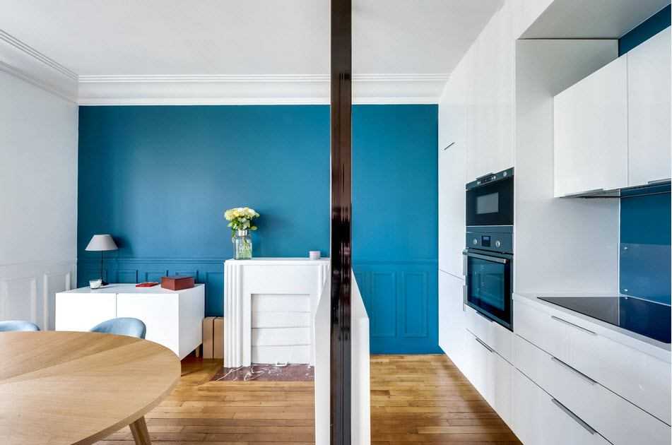 синие стены подчеркивают белоснежный цвет кухонного гарнитура
