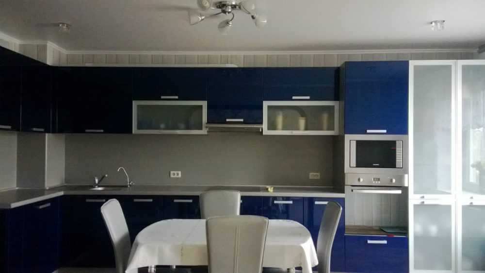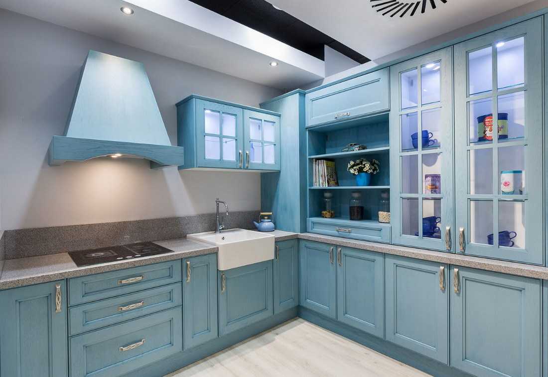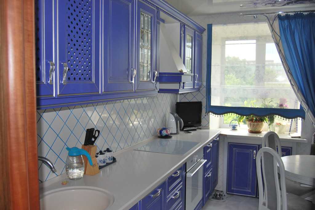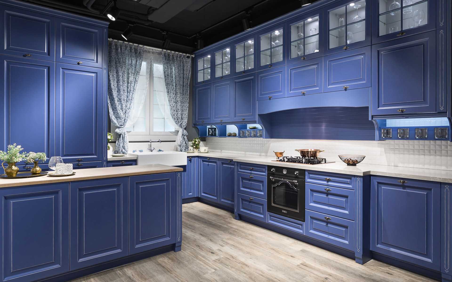 Гарнитур синего цвета в интерьере кухни, подбор фасада