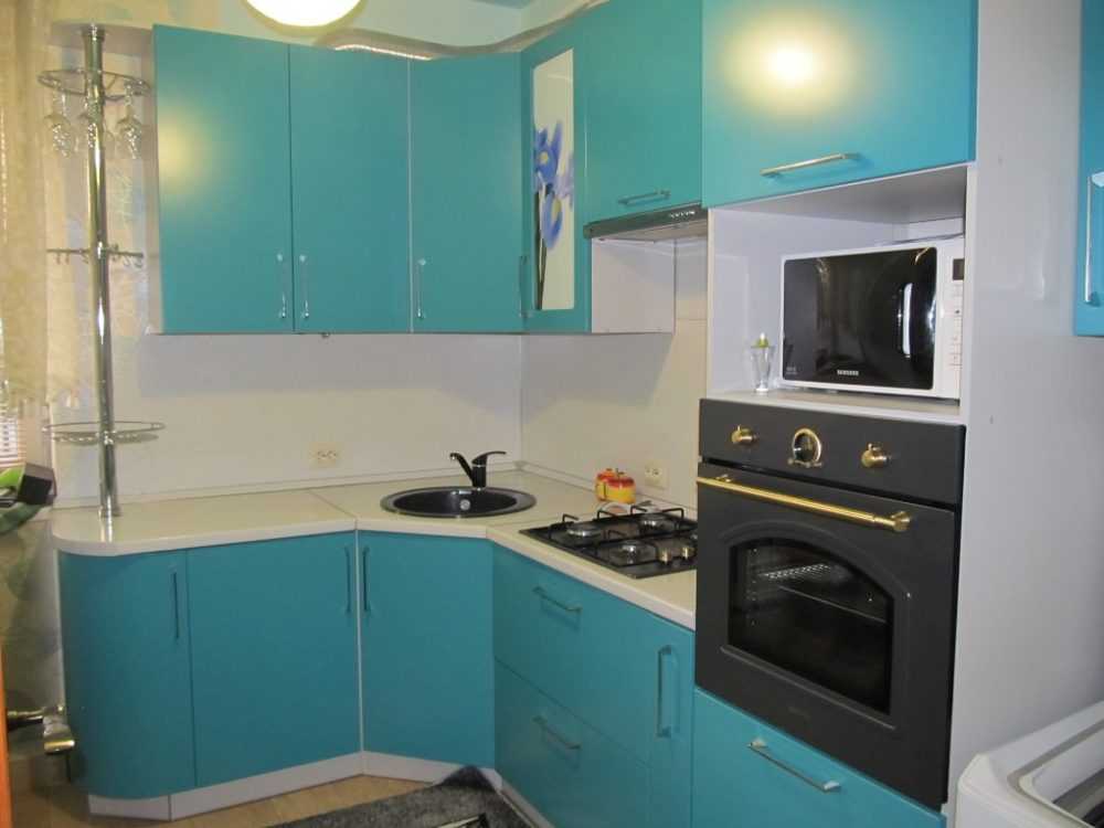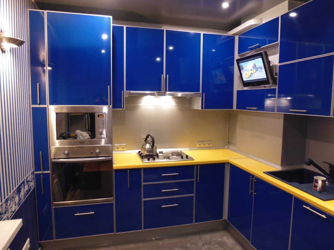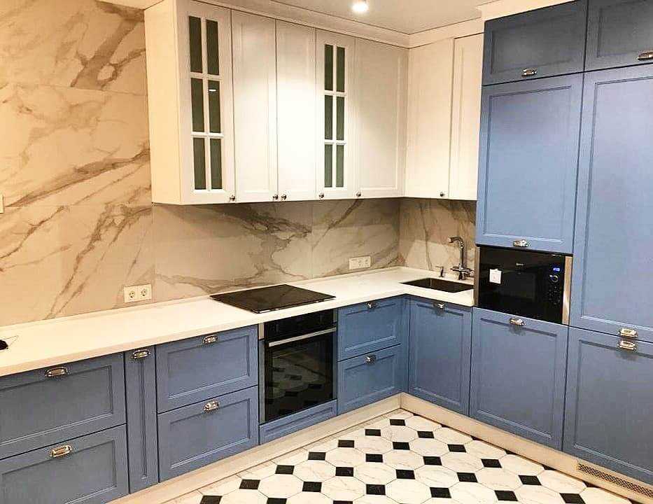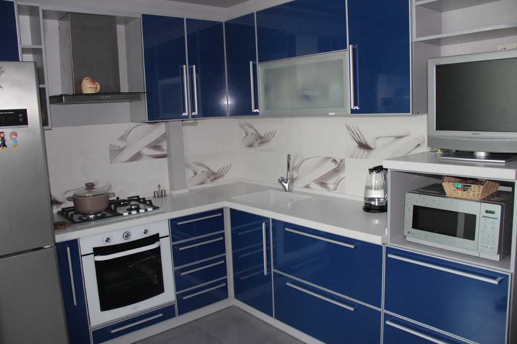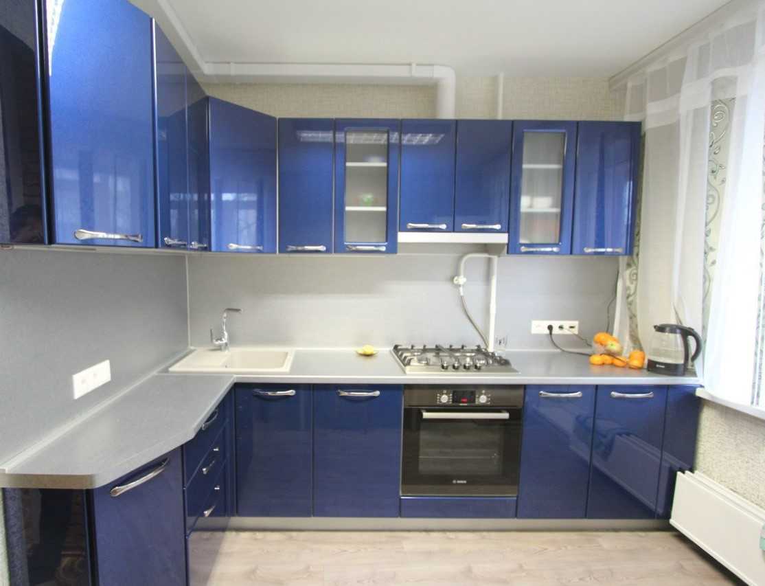 Гарнитур синего цвета в интерьере кухни, подбор фасада