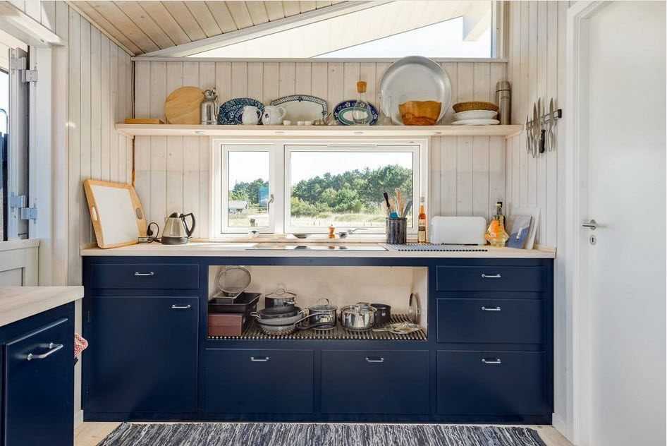 Если на кухне есть большое панорамное окно, его также можно украсить темносиними шторами. Подойдет этот оттенок и для отделки напольного покрытия. На маленькой кухне темно-синей может быть фурнитура, аксессуары, декоративные элементы.
