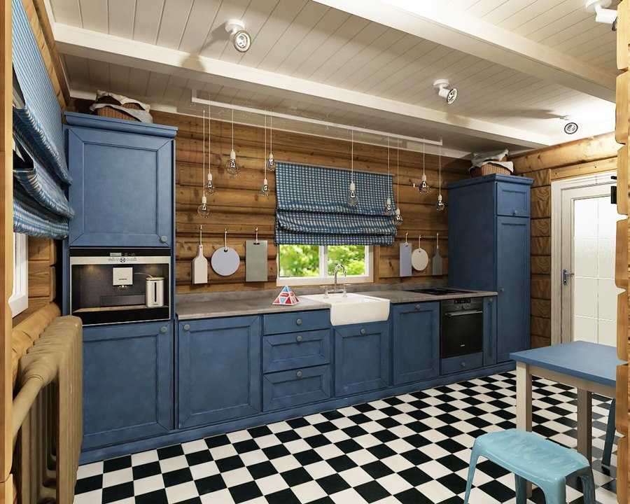 На фото отделка в натуральных тонах в интерьере синей кухни.