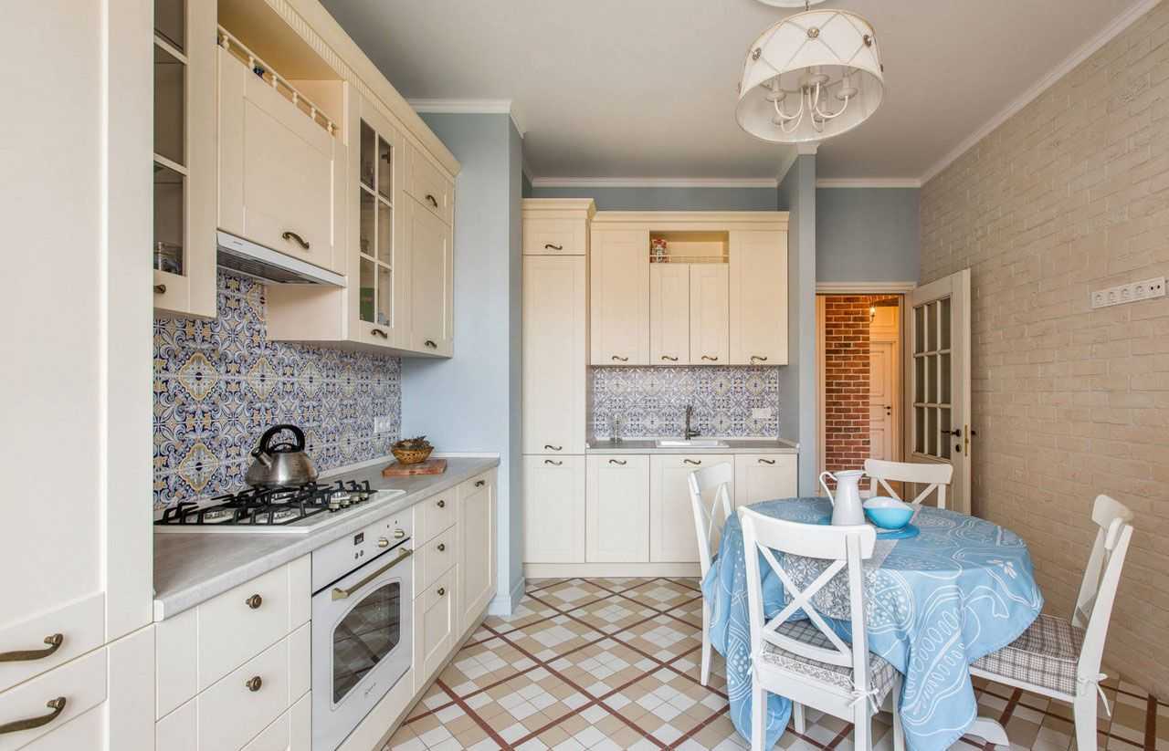 Со всеми светло-голубыми тонами в интерьере будет хорошо сочетаться пол, обустроенный из темно-синего керамогранита. Фартук тоже можно сделать светлым, но все же на один тон темнее, чем стены. Завершить интерьер поможет текстиль — шторы и скатерть нескольких оттенков светло-голубого.