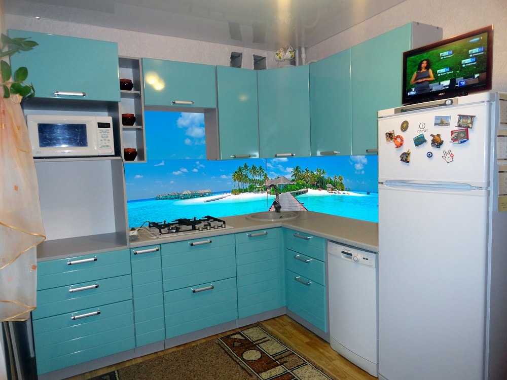 Для акцентного и яркого фартука подойдут сочные оттенки бирюзового, лазурного, цвета морской волны
