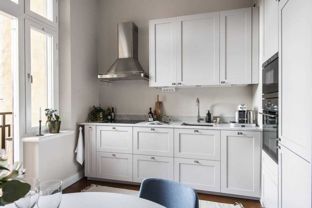 - Учитывайте размер. Небольшие по площади помещения лучше всего оформлять в светлых гаммах. Все оттенки белого помогут визуально расширить пространство, добавить воздуха, света, раздвинуть границы. Белая палитра, вопреки распространенному мнению, довольно богата: кипельно белый, снег, слоновая кость, яичная скорлупа и другие. Все они великолепно сочетаются между собой и другими палитрами. Чтобы белая кухня не казалась унылой, достаточно добавить красивые яркие акценты, разнообразить используемые фактуры. Помимо белого цвета, очень хороши для небольших помещений светло-серый, светло-голубой, беж, кремовый цвет.