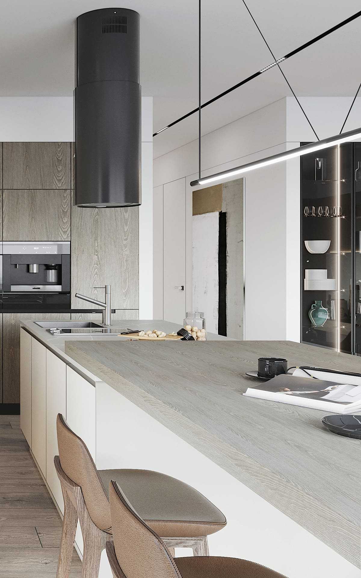 Стиль Hi-Tech достаточно популярен среди дизайнеров интерьеров и подрядчиков по ремонту, это высочайшая функциональность и ультрасовременная отделка. Футуристические белые кухонные острова и шкафы в стиле Hi-Tech выглядят невероятно на фоне темных стен, пола и потолка. Белые монохромные элементы, такие как люстры, вытяжная система, кварцевые столешницы, идеально сочетаются с холодными оттенками Hi-Tech.