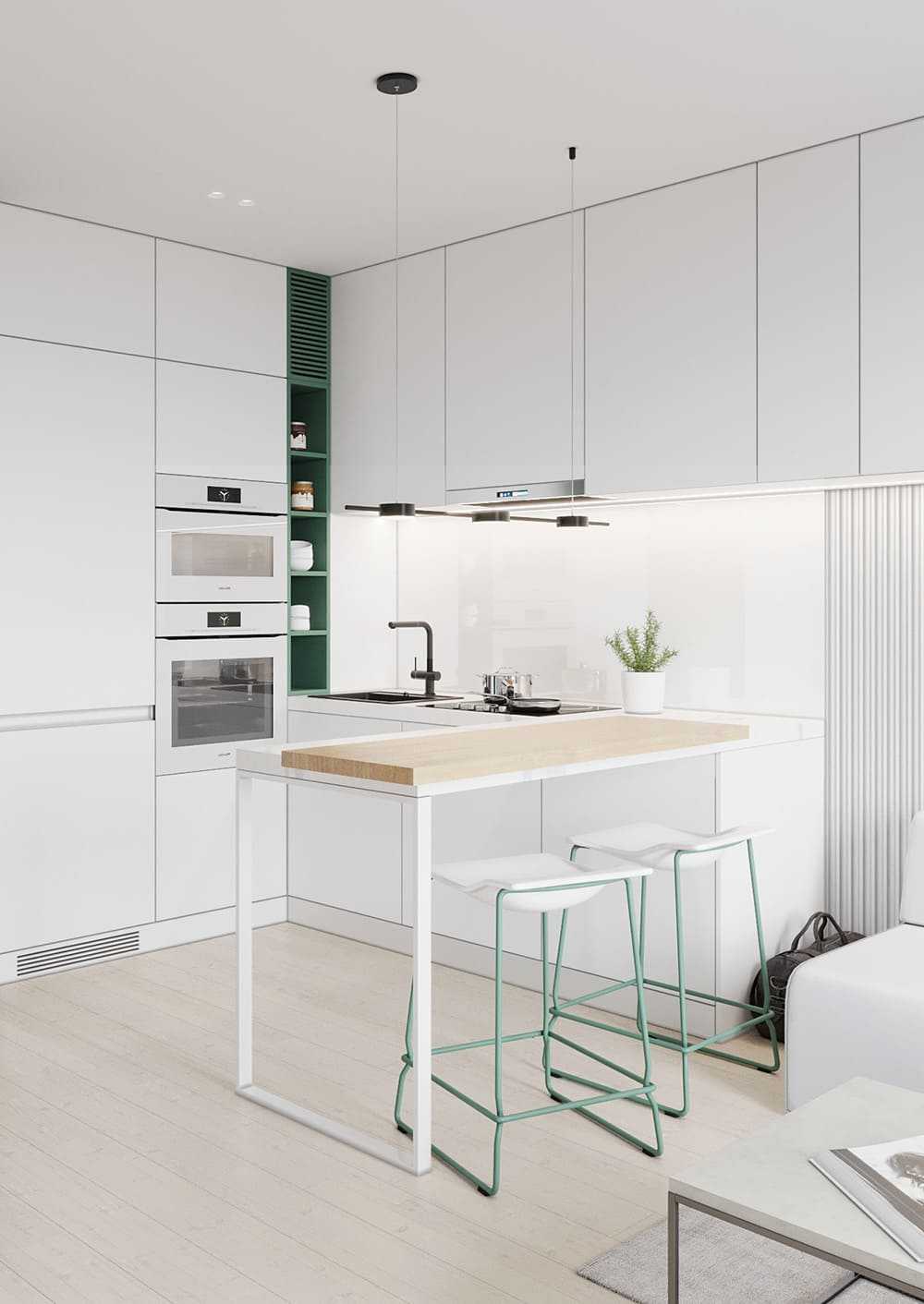 Полностью белая мебель или стены, окрашенные в светлые тона, контрастирующие с полами и потолком, украшенные несколькими красочными акцентами (красные фасады шкафов, ярко-зеленый текстиль, серебряный подвесной светильник, лимонно-желтое осветительное оборудование), продемонстрируют ваш изысканный вкус и нестандартное мышление.