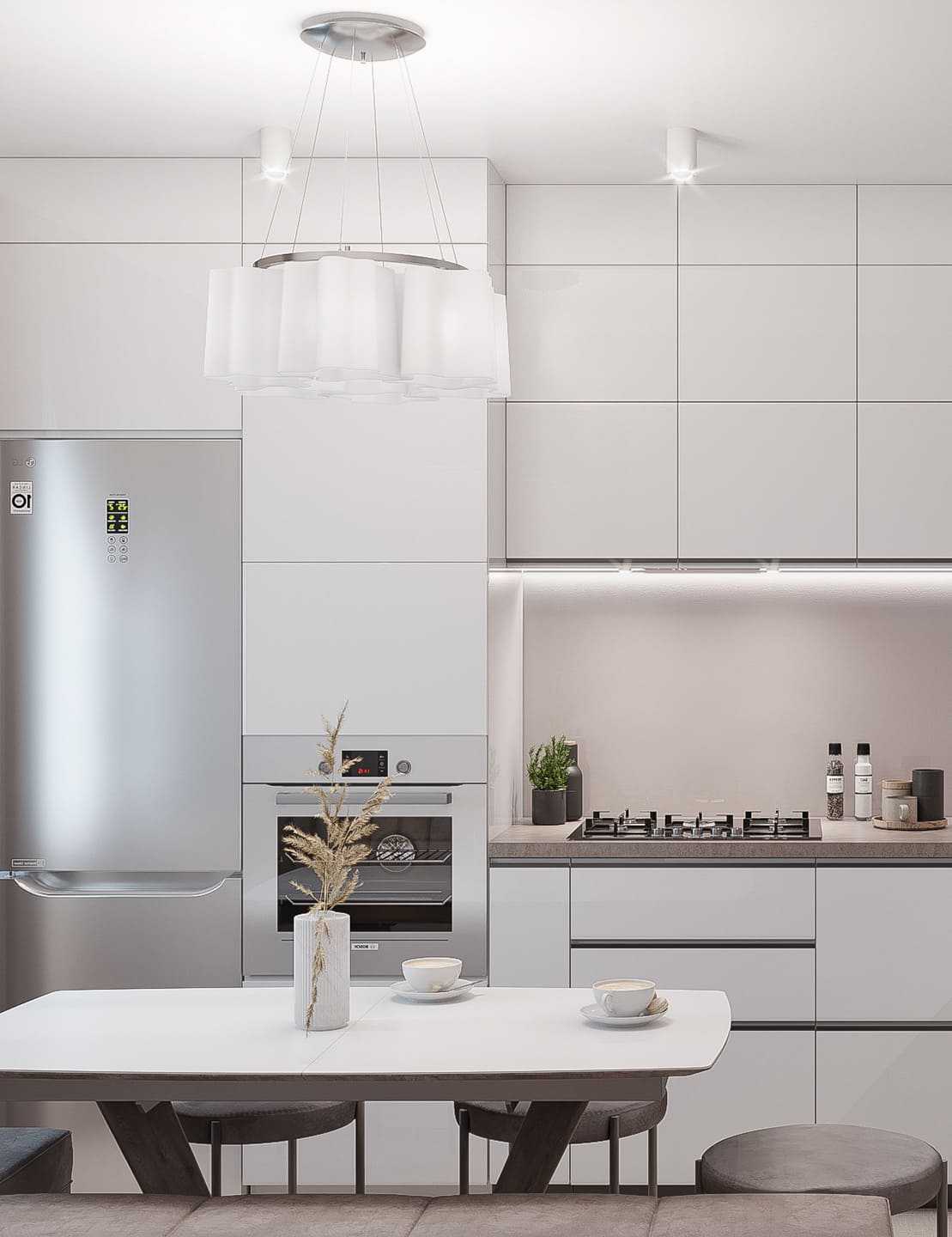 Оформить современный дизайн-проект белой кухни 2022, отвечающий всем требованиям стиля Hi-Tech – совсем несложно. Достаточно использовать два-три тона, чтобы добиться самого модного тренда: белый и серый, черный и белый, серебристый и белый, белый и графитовый.