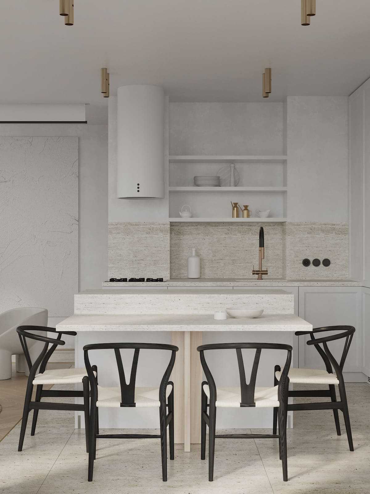 Разбавить монохромность белого помещения поможет обеденная зона, если установить на ней стол и стулья черного цвета. Темным может быть также пол.
