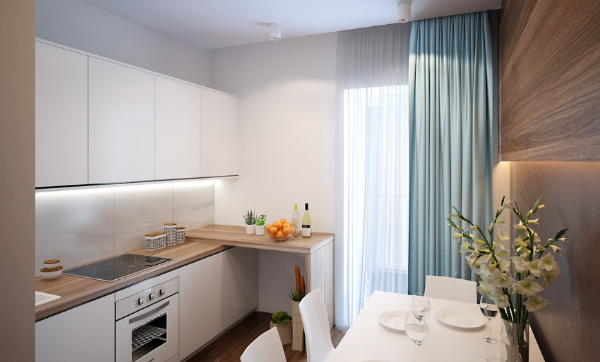 В помещение такой планировки хорошо впишется откидной стол или стол-подоконник, который позволит увеличить пространство кухни. Можно из части оконного проема сделать барную стойку и использовать ее как рабочую поверхность или обеденный стол.