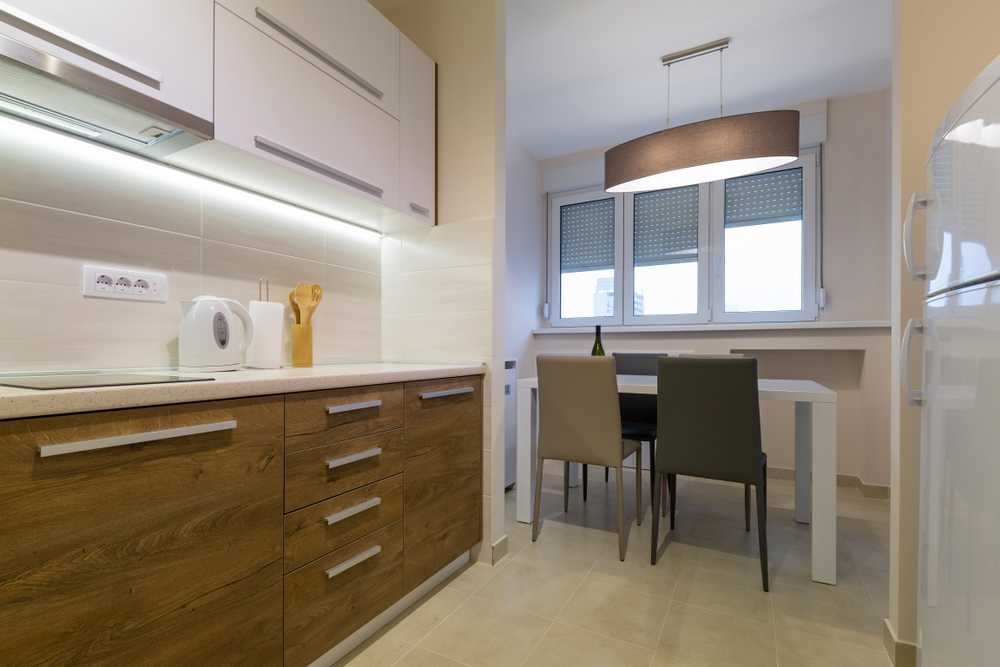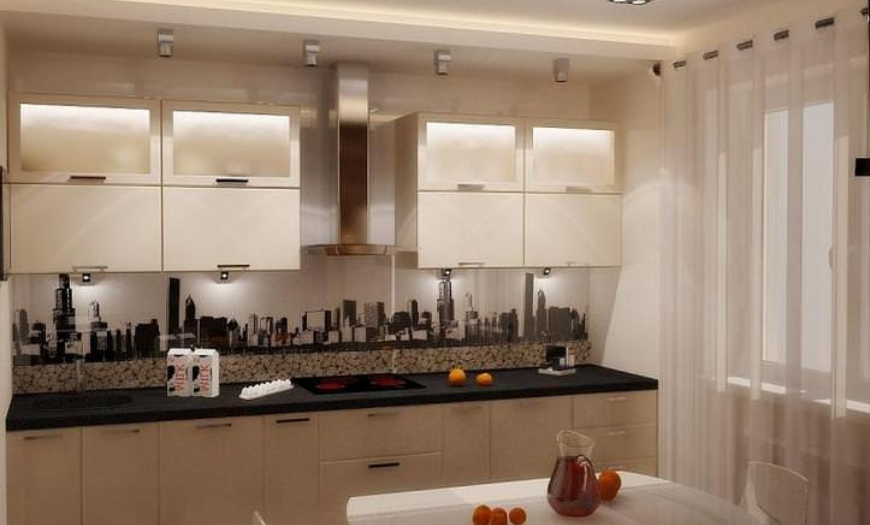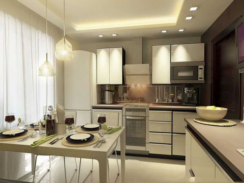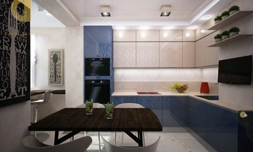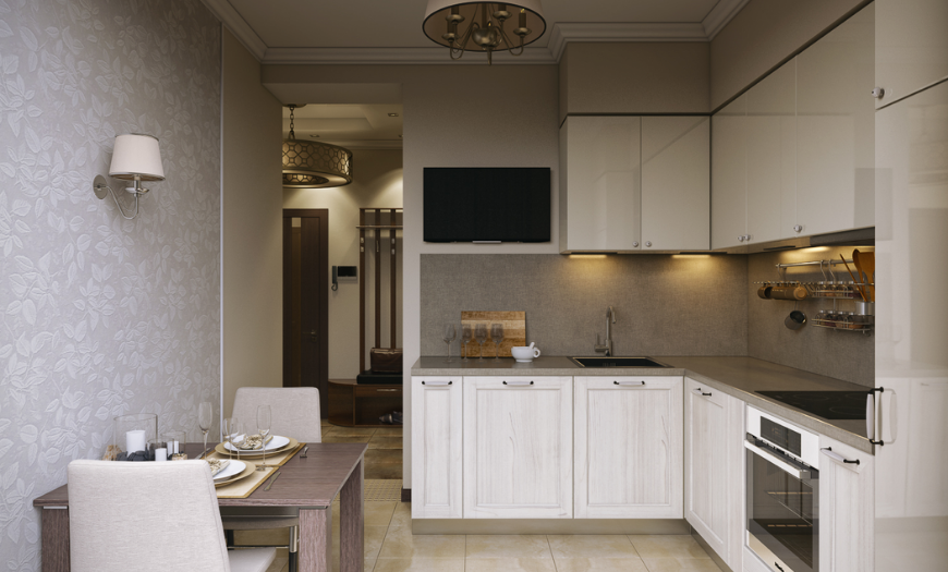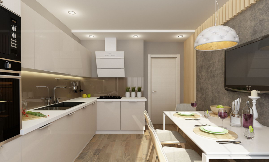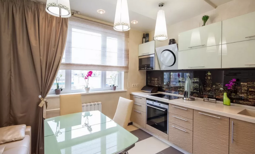 Кухонный гарнитур ставится вдоль одной из стен. Высвобождается много места для обеденной зоны, где можно поместить даже диван и несколько стульев около большого стола, желательно раскладного.