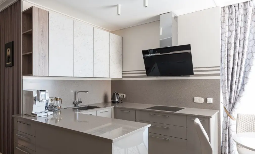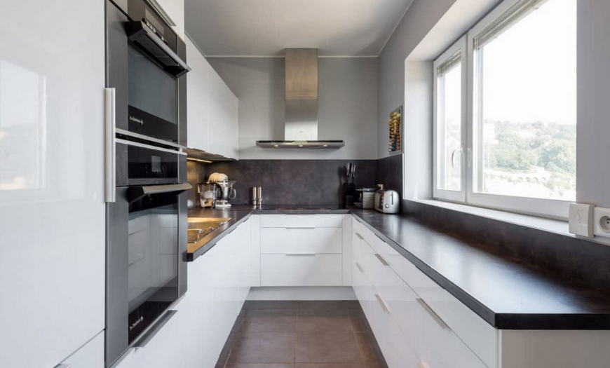 Удобно при большом количестве встроенной техники, а также в квартирах-студиях. Рабочая зона оформляется в форме буквы «П», но могут возникнуть трудности с обеденной зоной. Для устранения этой проблемы кухонный гарнитур расставляют в виде полуострова или барной консоли.