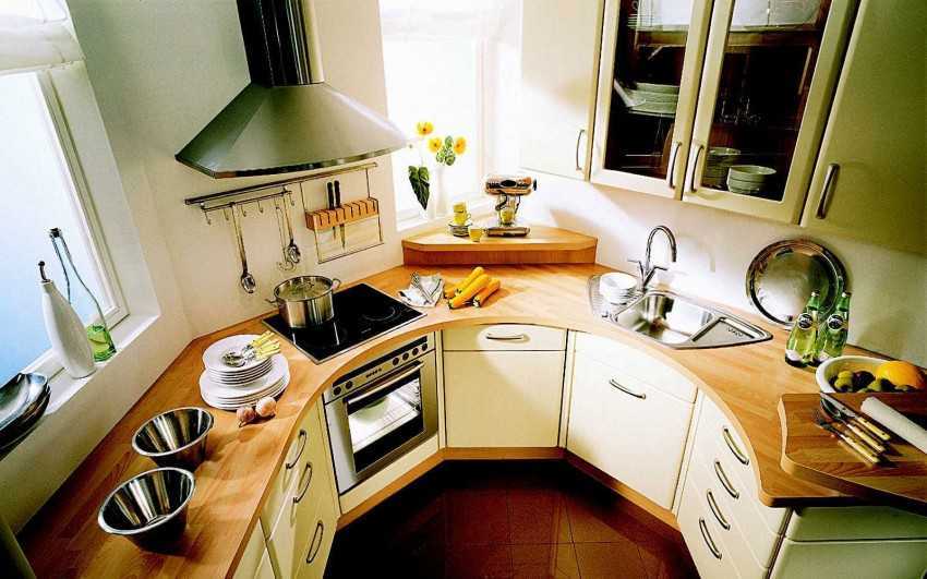 В небольших кухнях мойку стоит устанавливать в угол. После мойки должна идти зона для приготовления пищи и плита. Под раковиной в угловом шкафчике может быть много пространства.